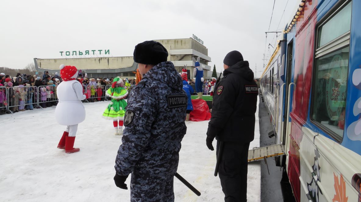 Сотрудники Средневолжского линейного управления МВД России на транспорте и Управления Росгвардии по Самарской области обеспечили безопасность и общественный порядок во время праздничных мероприятий по случаю прибытия на железнодорожную станцию Тольятти Поезда Деда Мороза.