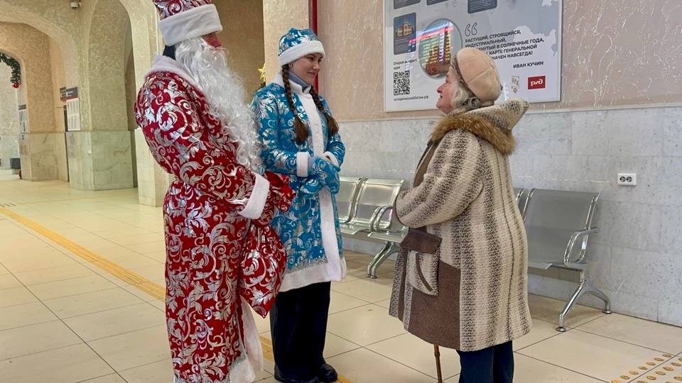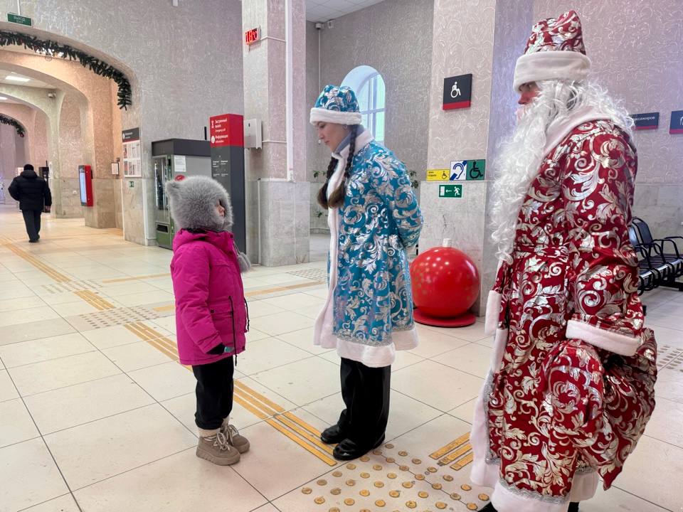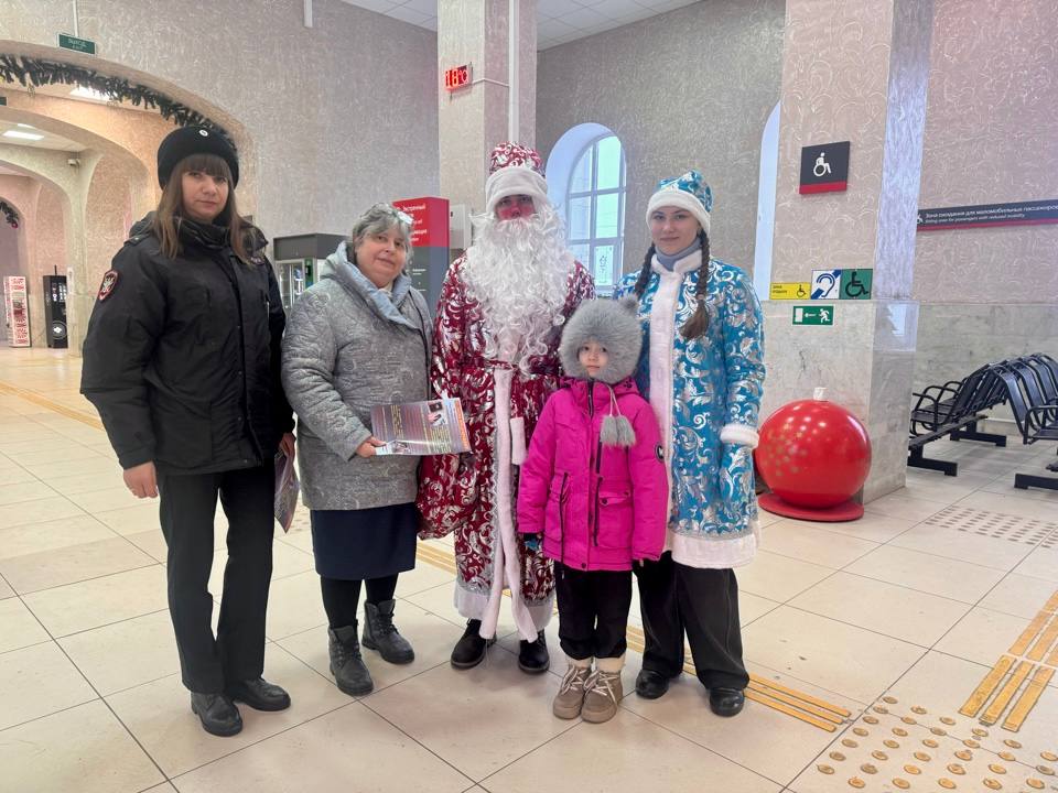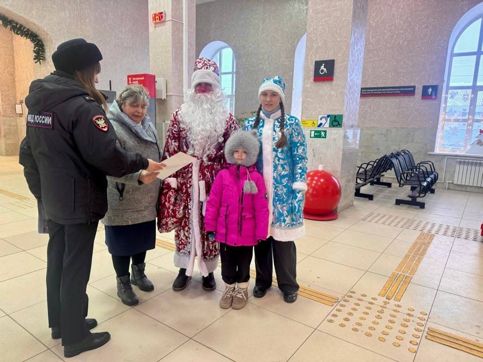 Сказочные персонажи вместе со стражами правопорядка поздравляли с наступающим Новым годом пассажиров, разъясняли им правила безопасного поведения на объектах железной дороги, а также раздавали памятки и буклеты профилактического характера и сладкие подарки.