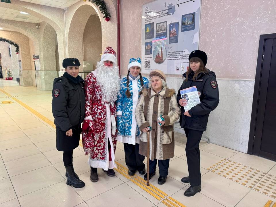 В рамках Всероссийской акции «Полицейский Дед Мороз» сотрудники Тамбовского линейного отдела МВД России на транспорте провели профилактическое рейдовое мероприятие на перроне железнодорожного вокзала, в пригородном поезде сообщением Тамбов - Кирсанов и на перегоне.