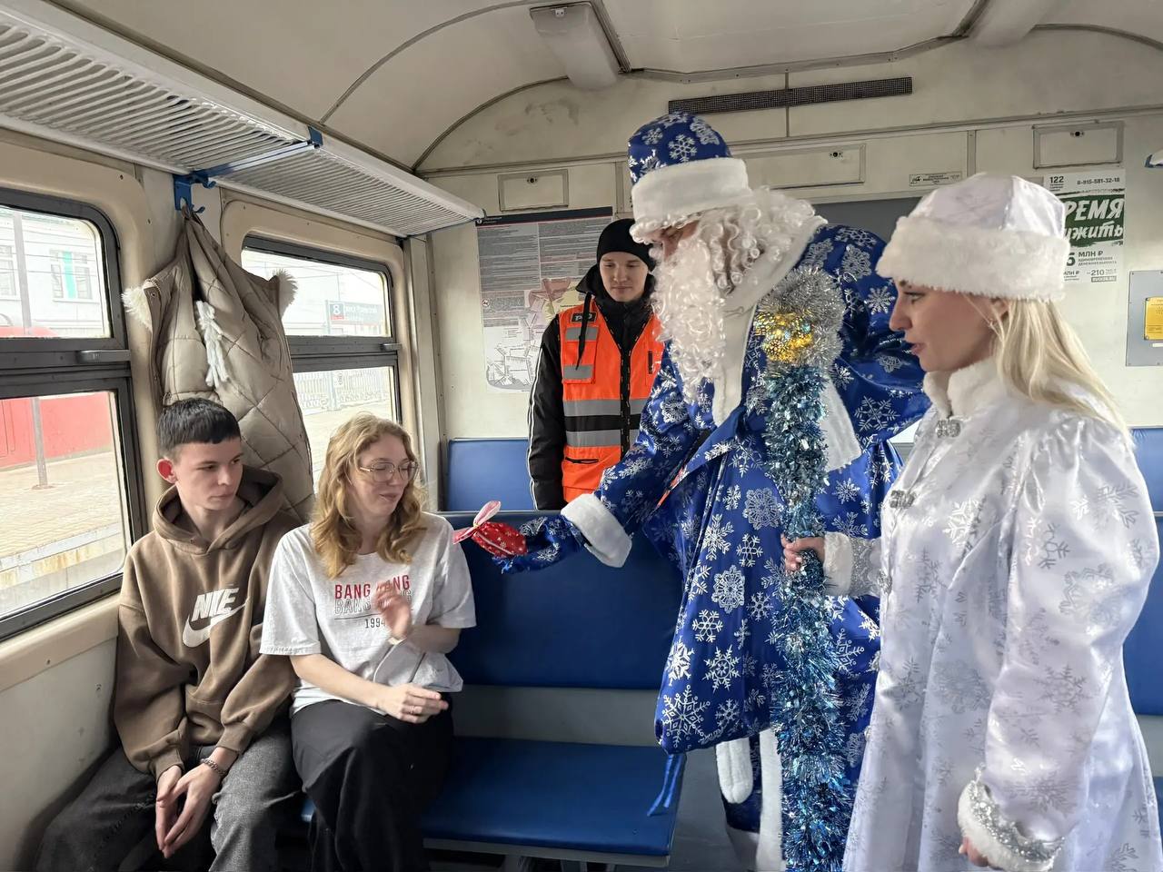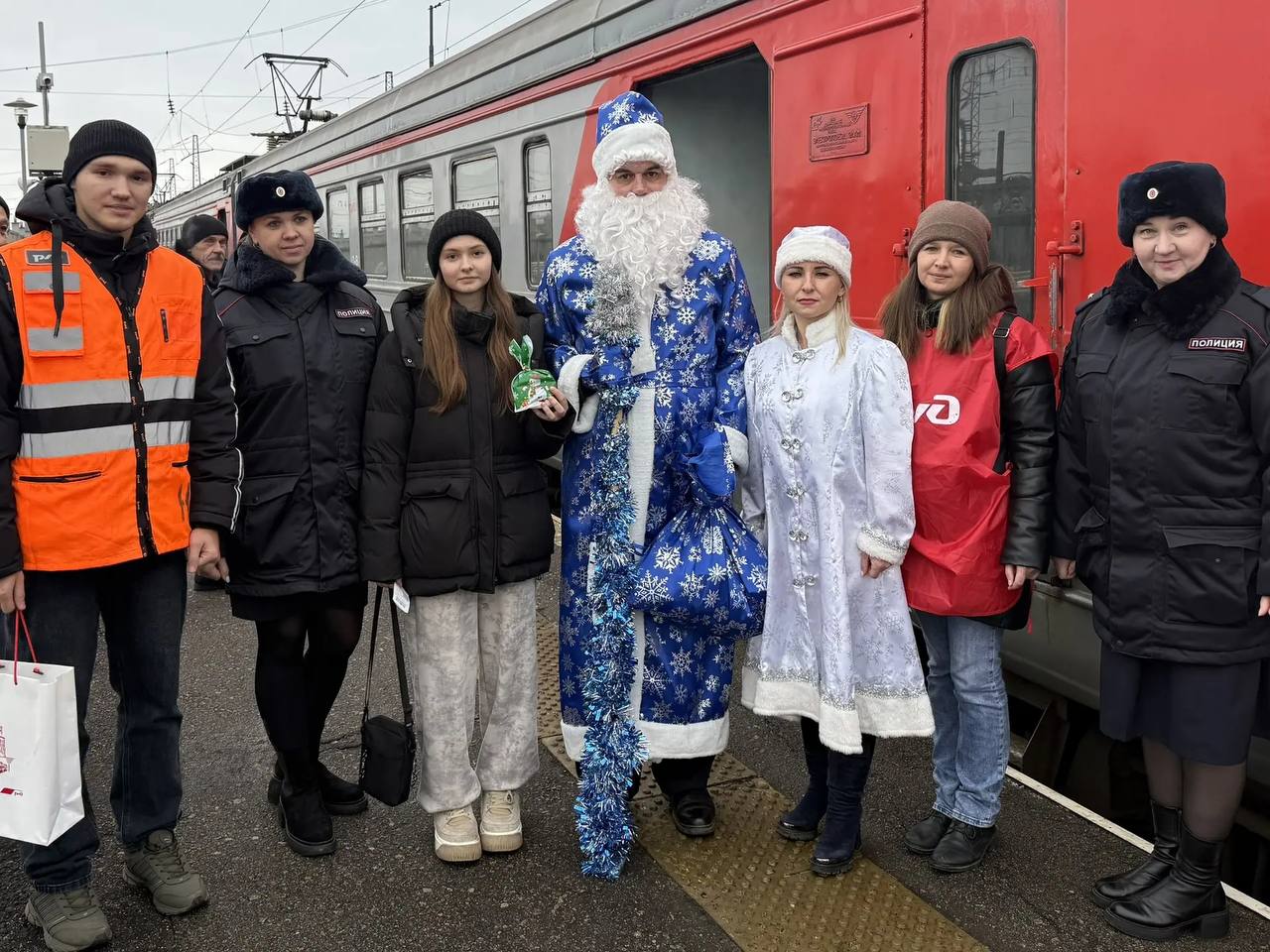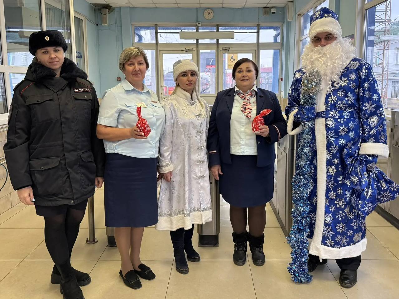 Сотрудники транспортной полиции нарядились в костюмы Деда Мороза и Снегурочки, чтобы создать праздничное настроение и привлечь внимание граждан. Сказочные персонажи и представители железной дороги, раздавали пассажирам информационные листовки с советами по безопасности во время новогодних поездок, а так же рассказали об ответственности за нарушение правил безопасности на объектах железнодорожной инфраструктуры.