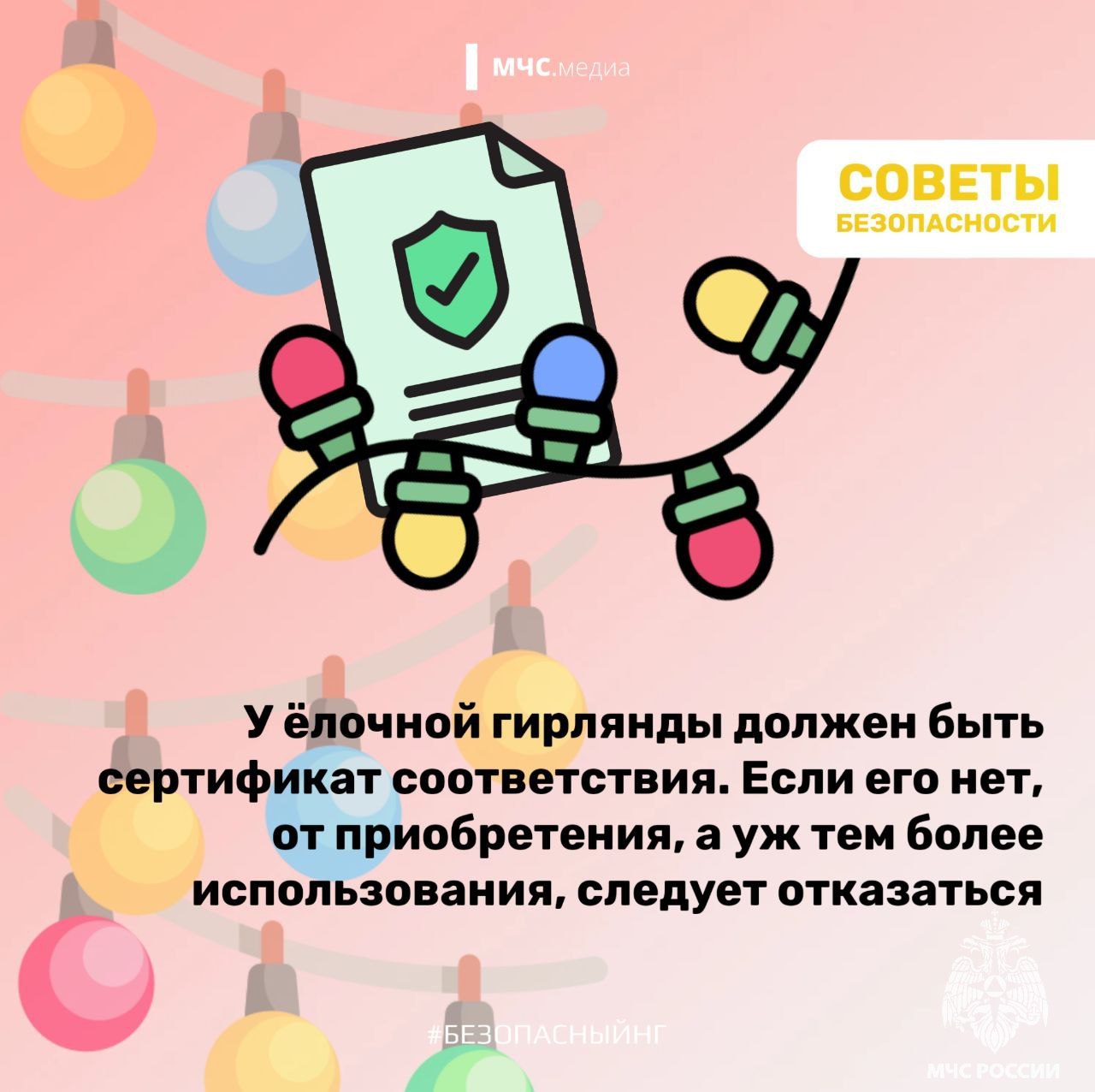 Чтобы новогодние праздники не превратились в трагедию, украшай свой дом только сертифицированными гирляндами и помни о важных правилах безопасности. Читай и запоминай полезные памятки МЧС России!