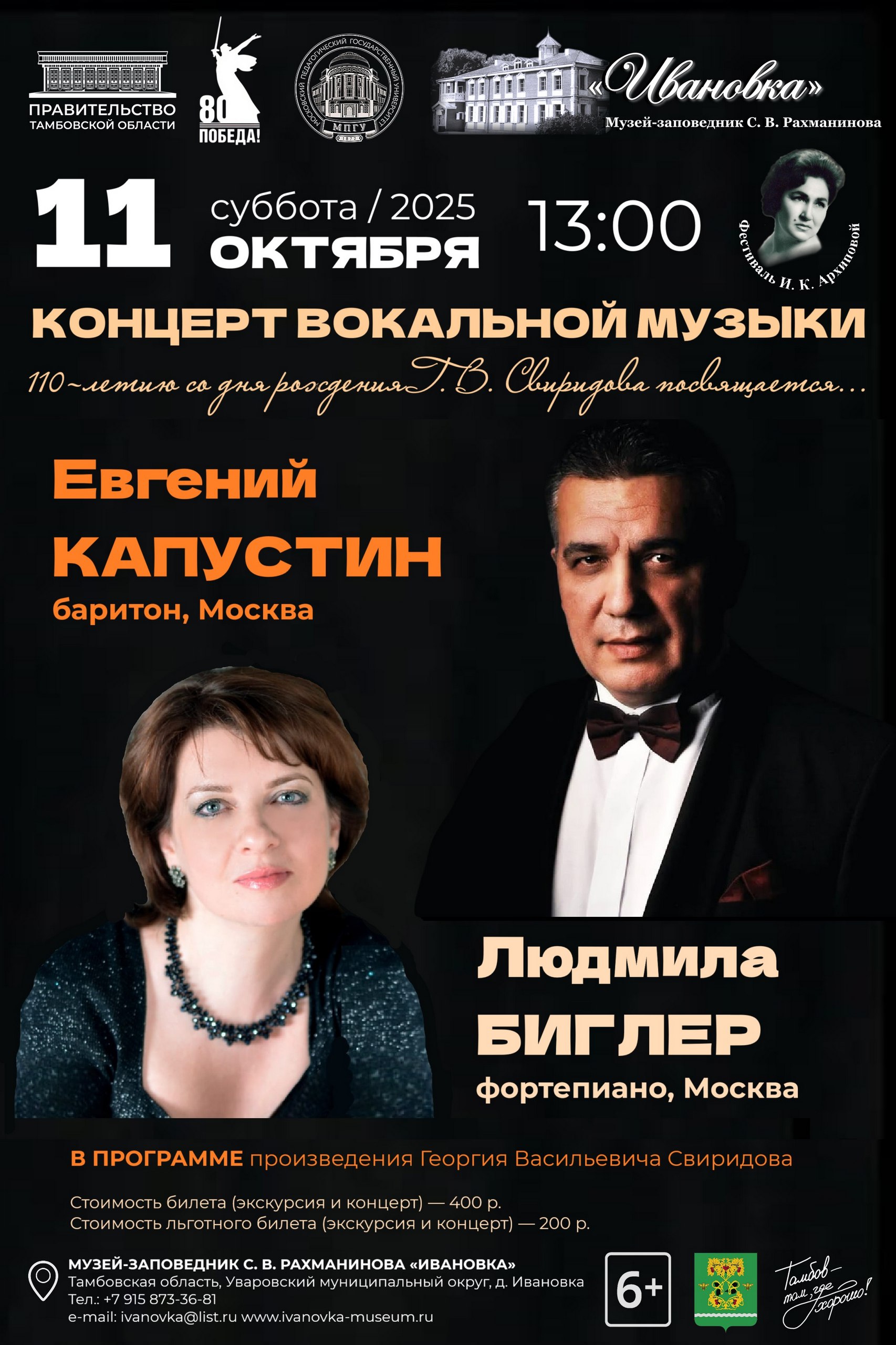В программе прозвучат романсы, песни и фрагменты из вокальных циклов Г.В. Свиридова в исполнении лауреатов международных конкурсов Евгения Капустина (баритон) и Людмилы Биглер (фортепиано). Публика услышит «Шесть романсов на слова А. Пушкина», «Петербург» на слова А. Блока, «Отчалившая Русь» на слова С. Есенина.