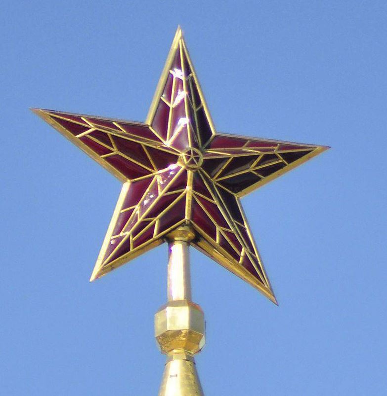 24 октября 1935 года первая металлическая звезда с перекрещенными серпом и молотом, украшенная уральскими самоцветами, была поднята на Спасскую башню. Позднее звезды были водружены и на другие башни Кремля. Спустя два года, в 1937 году, они были заменены на новые, изготовленные из рубинового стекла.