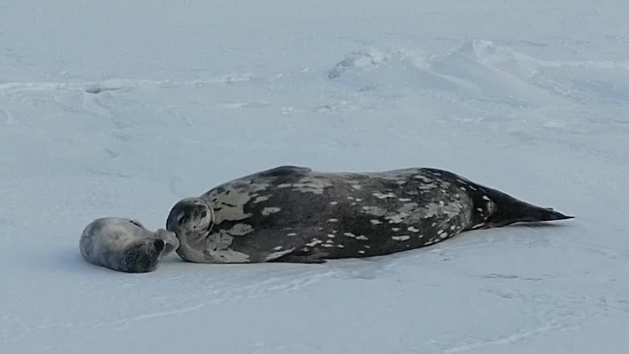 Первый тюленёнок с мамой обнаружен у островов Токарева. Чувствуют они себя хорошо, мама воспитывает и играет с детёнышем. А малыш беззаботно наслаждается маминым теплом и заботой.