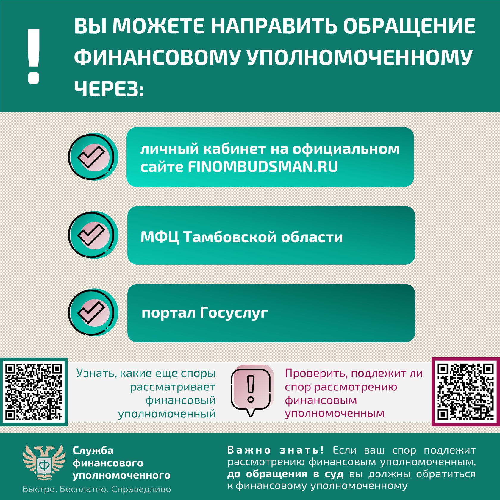 Направить обращение финансовому уполномоченному можно через личный кабинет на сайте finombudsman.ru или через МФЦ Тамбовской области.