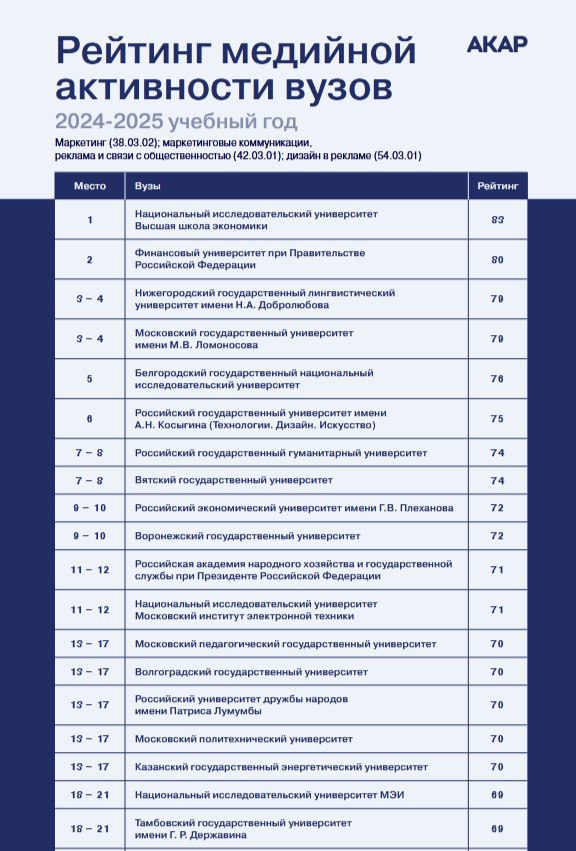 Комиссия по профессионально-общественной аккредитации АКАР совместно с Аналитическим центром Российской индустрии рекламы опубликовала рейтинг медийной активности российских вузов. В исследование 2025 года включили 217 университетов.