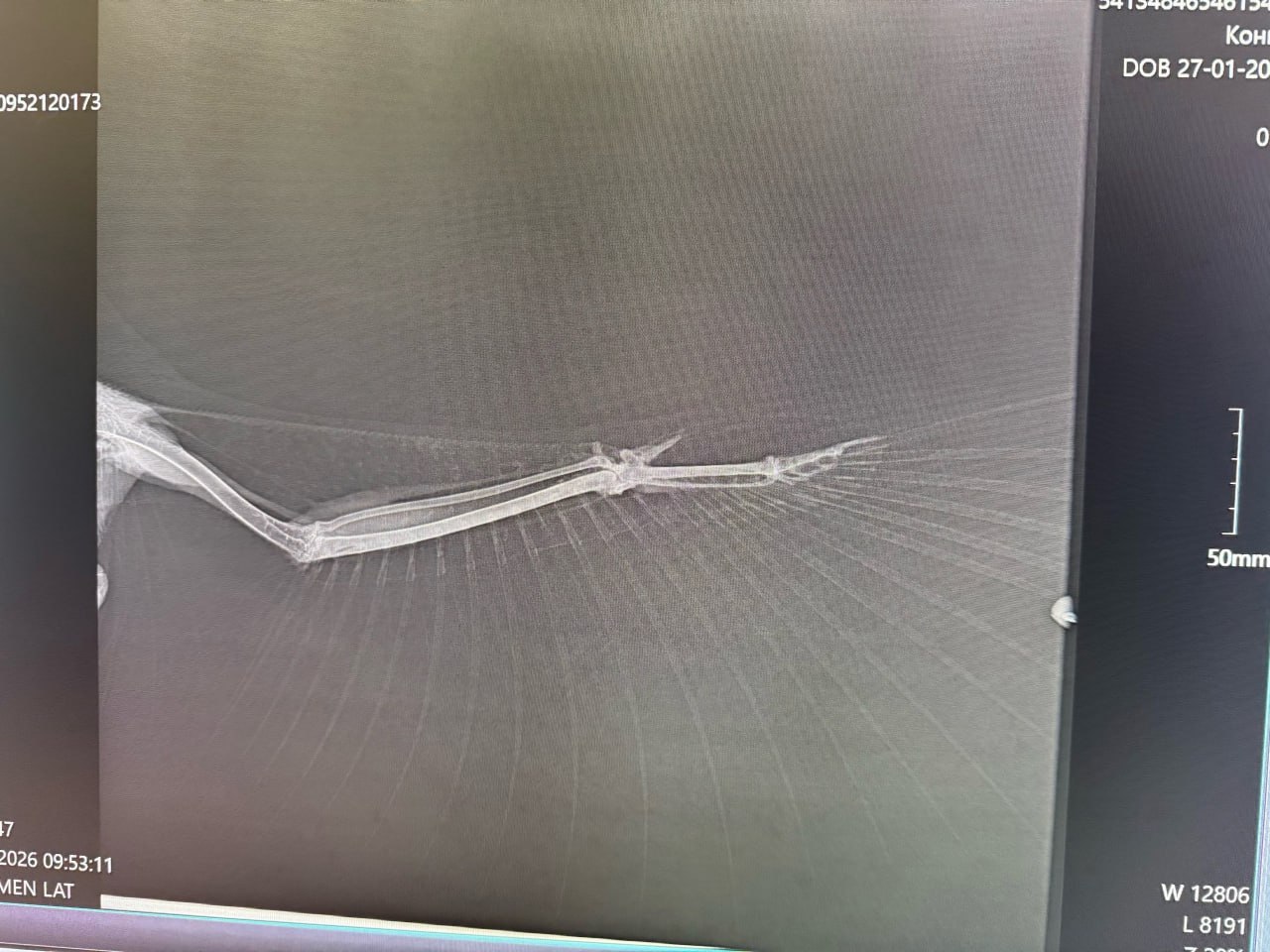 У птицы диагностированы травма запястного сустава, ушиб и повреждение кожи. Общее состояние оценивается как удовлетворительное, признаков сильного истощения нет, однако за зиму она заметно потеряла в весе.