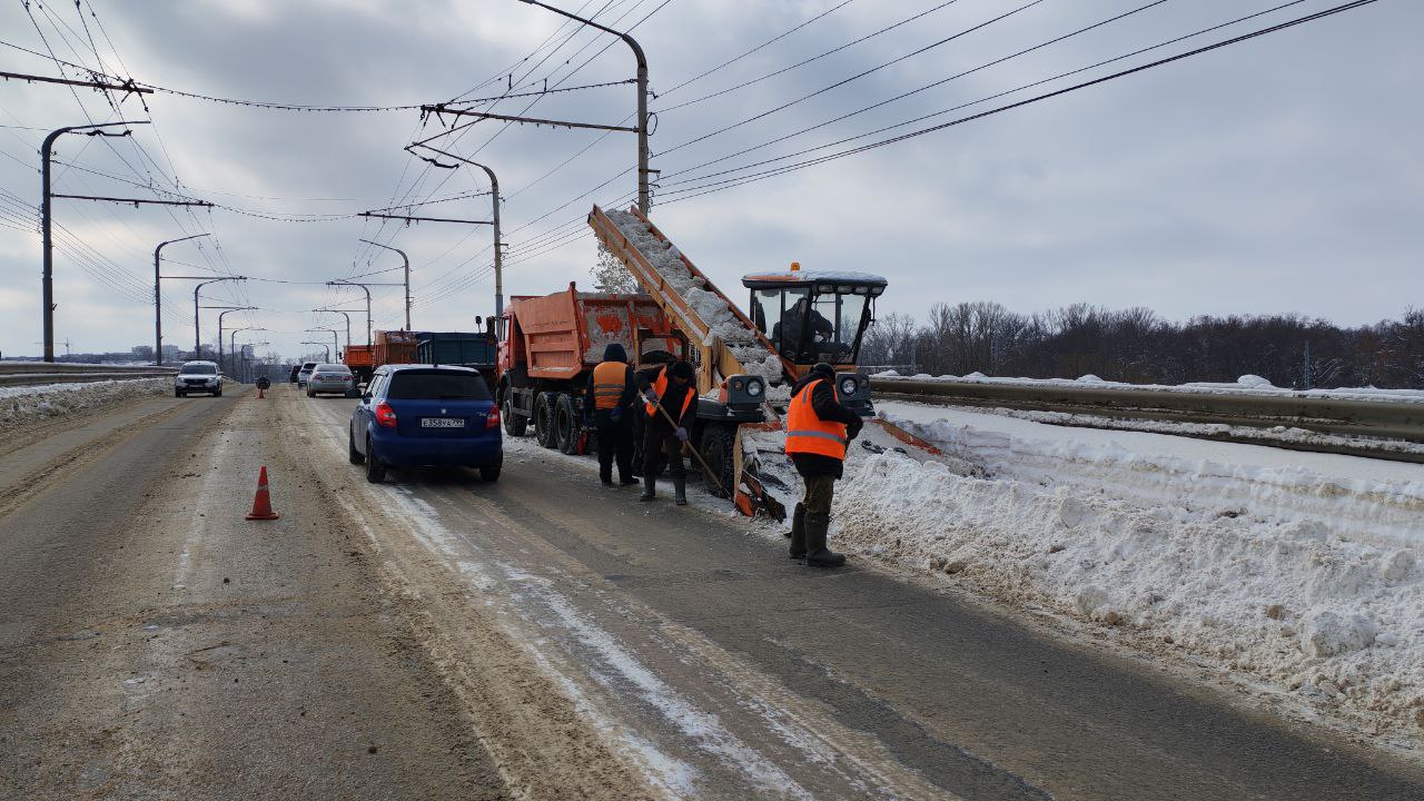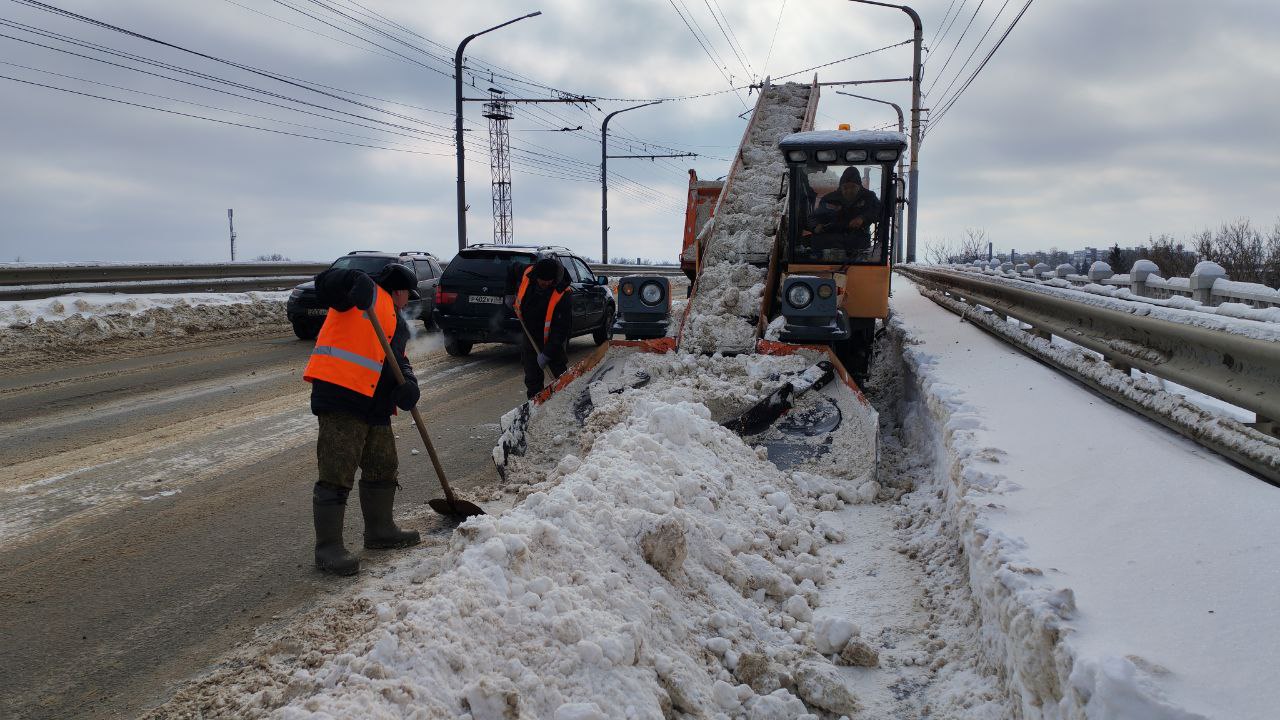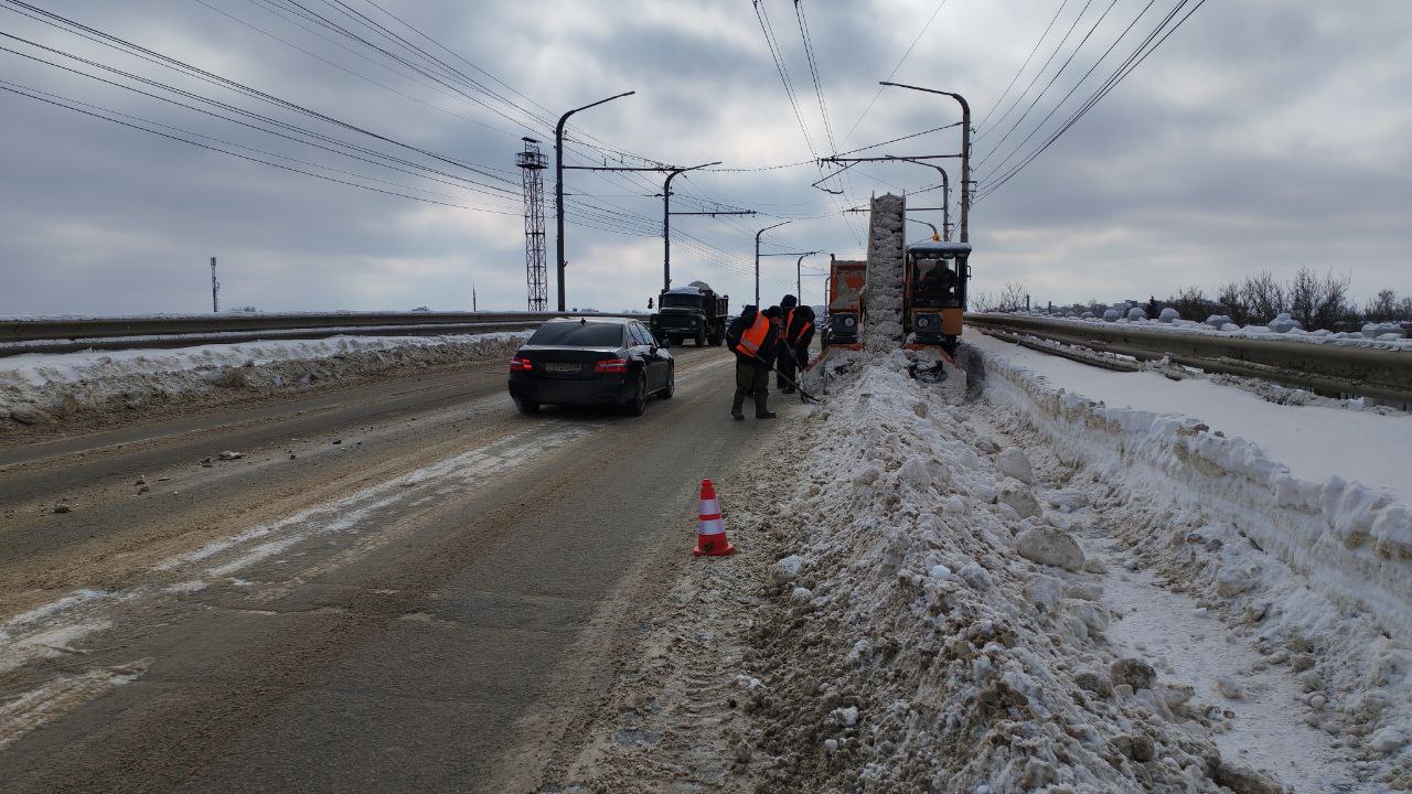 На Лермонтовском мосту работы проведены, на Октябрьском завершат сегодня ночью. С утра проходит расчистка Астраханского путепровода. К уборке привлечено 10 единиц техники - снегопогрузчик золотые ручки и самосвалы, также трудятся рабочие.