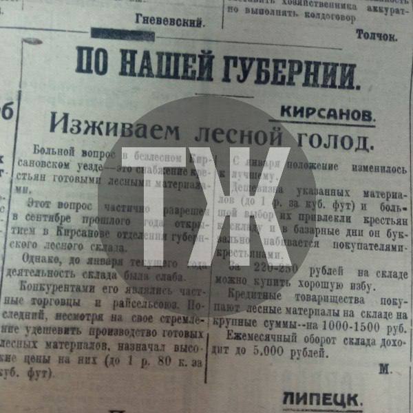 В Кирсановском уезде, чтобы снабжать население пиломатериалами, открыли отделение губернского лесного склада. С той поры прошло уже полтора года, а оно так и не заработало в полную силу. Частные торговцы и райсельсоюз предлагают древесину на выгодных условиях, в том числе с доставкой на дом. Потеряв прибыль, руководство склада удешевило материалы. Ежемесячный оборот склада увеличился. За 250 рублей здесь стало можно приобрести качественную избу.