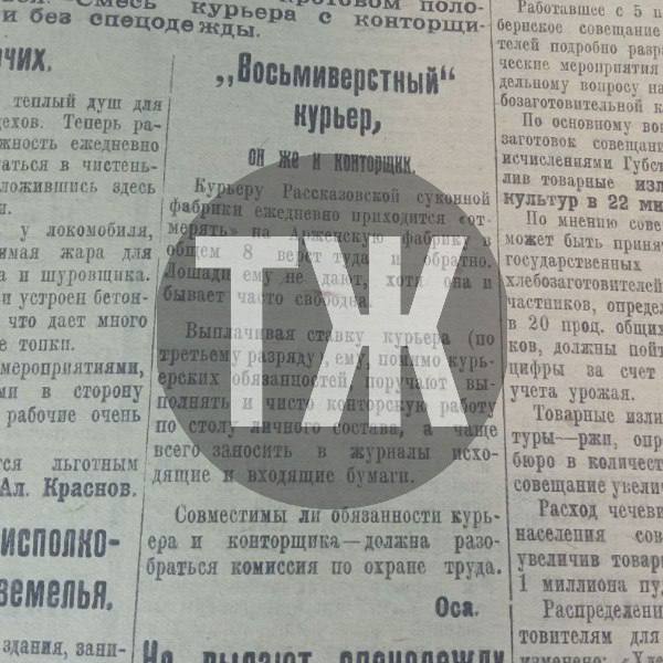 Курьер Рассказовской суконной фабрики совмещает несколько должностей за одну зарплату. По основной професии ему приходится ежедневнго пешком проходить более 16 верст. Лошадь не дают, хотя она ускорила бы доставку. Будучи по совместительству конторщиком, мужчина выполняет массу бумажной работы.