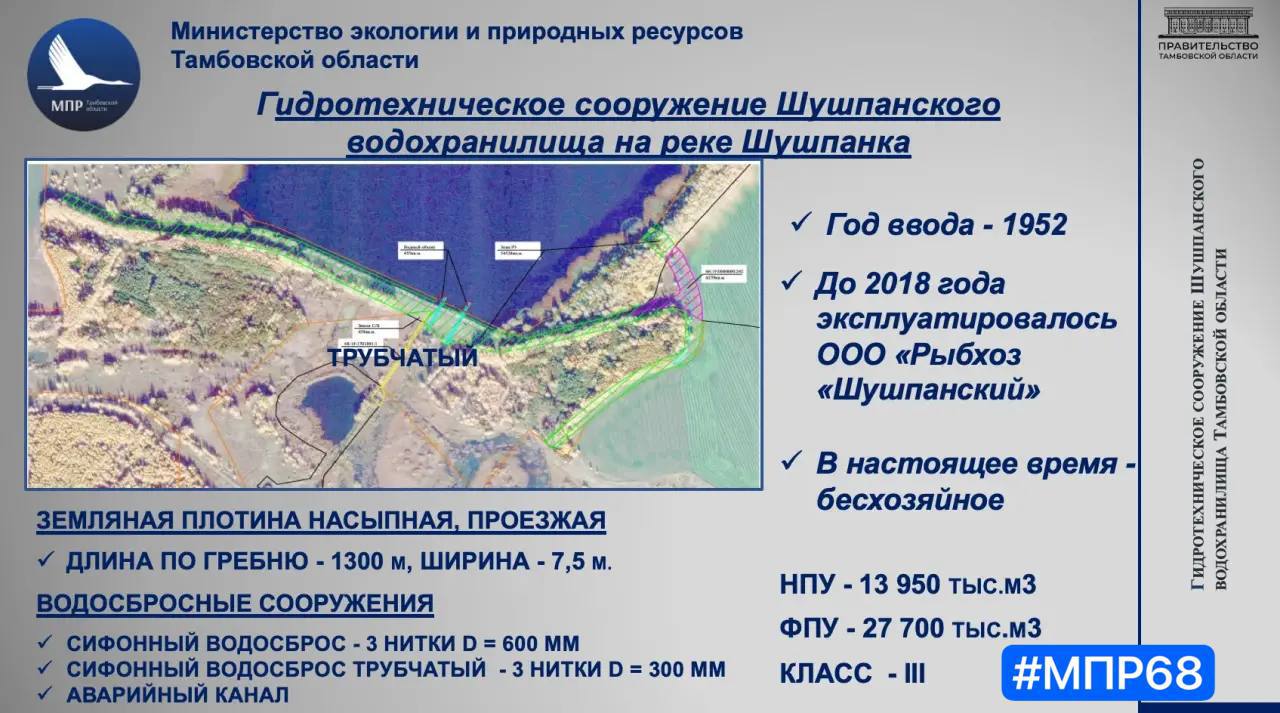 Шушпанское водохранилище – это излюбленное место для отдыха тамбовчан и соревнований по рыбной ловле. Гидротехническое сооружение там было введено в эксплуатацию почти 75 лет назад - в 1952-м. До 2018 года объект эксплуатировал «Рыбхоз «Шушпанский», но, по словам министра, надлежащее содержание ГТС не осуществлялось.