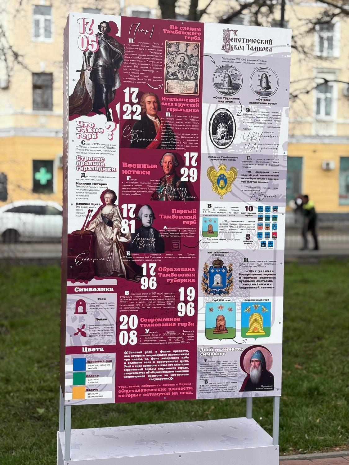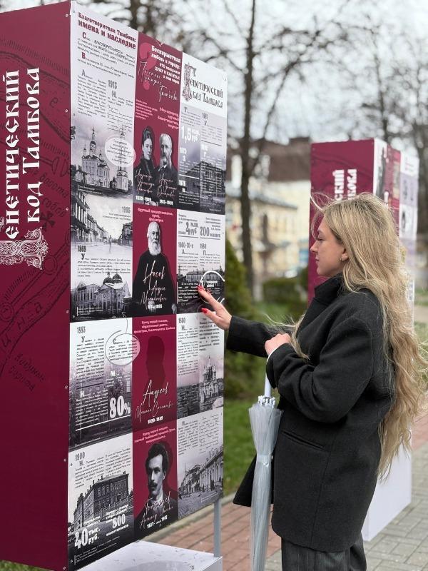 В сквере имени Петрова в областном центре появилась уличная инфографика под названием «Генетический код Тамбова» (0+). Каждый выставочный стенд — это сжатое, но содержательное повествование о поворотных вехах судьбы города. Тамбов сквозь века предстаёт и сторожевой крепостью Московского государства, и средоточием меценатства, и городом воинской доблести, и ареной градостроительной эволюции.
