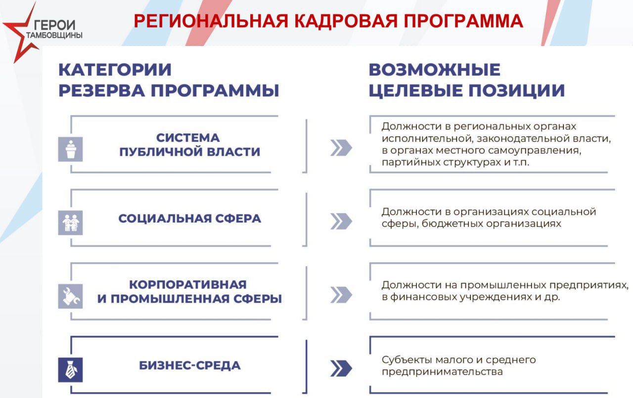 Проект «Герои Тамбовщины» появился в соответствии с поручением президента России Владимира Путина о создании в субъектах РФ кадровых проектов для участников и ветеранов спецоперации, аналогичных федеральной программе «Время героев».