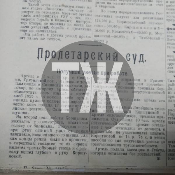 17-летняя крестьянка из села Синявки получила увечья во время работы в сельхозартели. Соломотряс вышел из строя, и трехдюймовые гвозди глубоко вонзились ей в руку. Девушку доставили в больницу. Поправив здоровье, она подала в суд на работодателя. Каждого члена артели обязали выплачивать пострадавшей по 14 рублей ежемесячно, пока она не выйдет на работу.