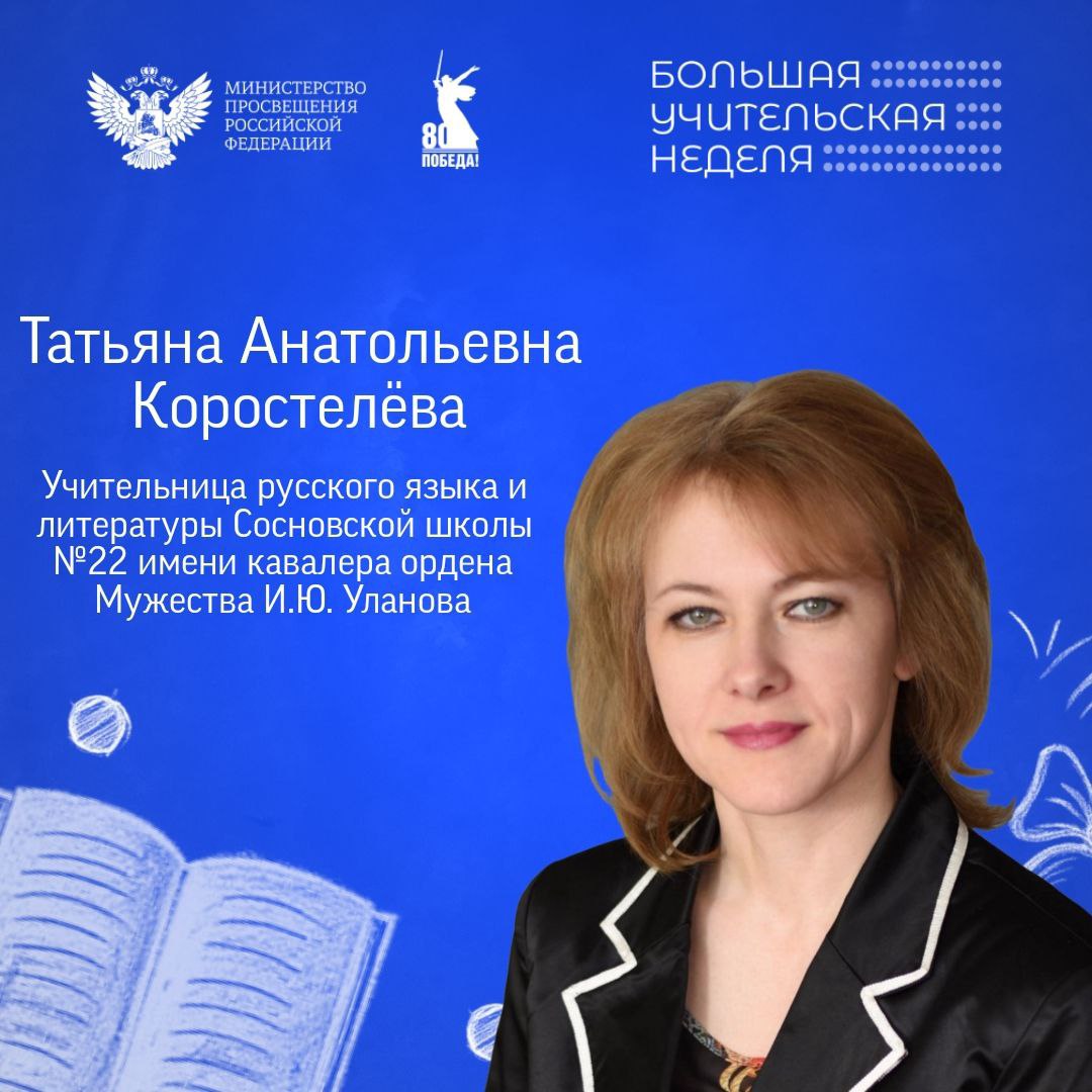 Коростелёва Тамара Анатольевна, учитель русского языка и литературы Сосновской школы № 2 имени кавалера ордена Мужества И. Ю. Уланова;
