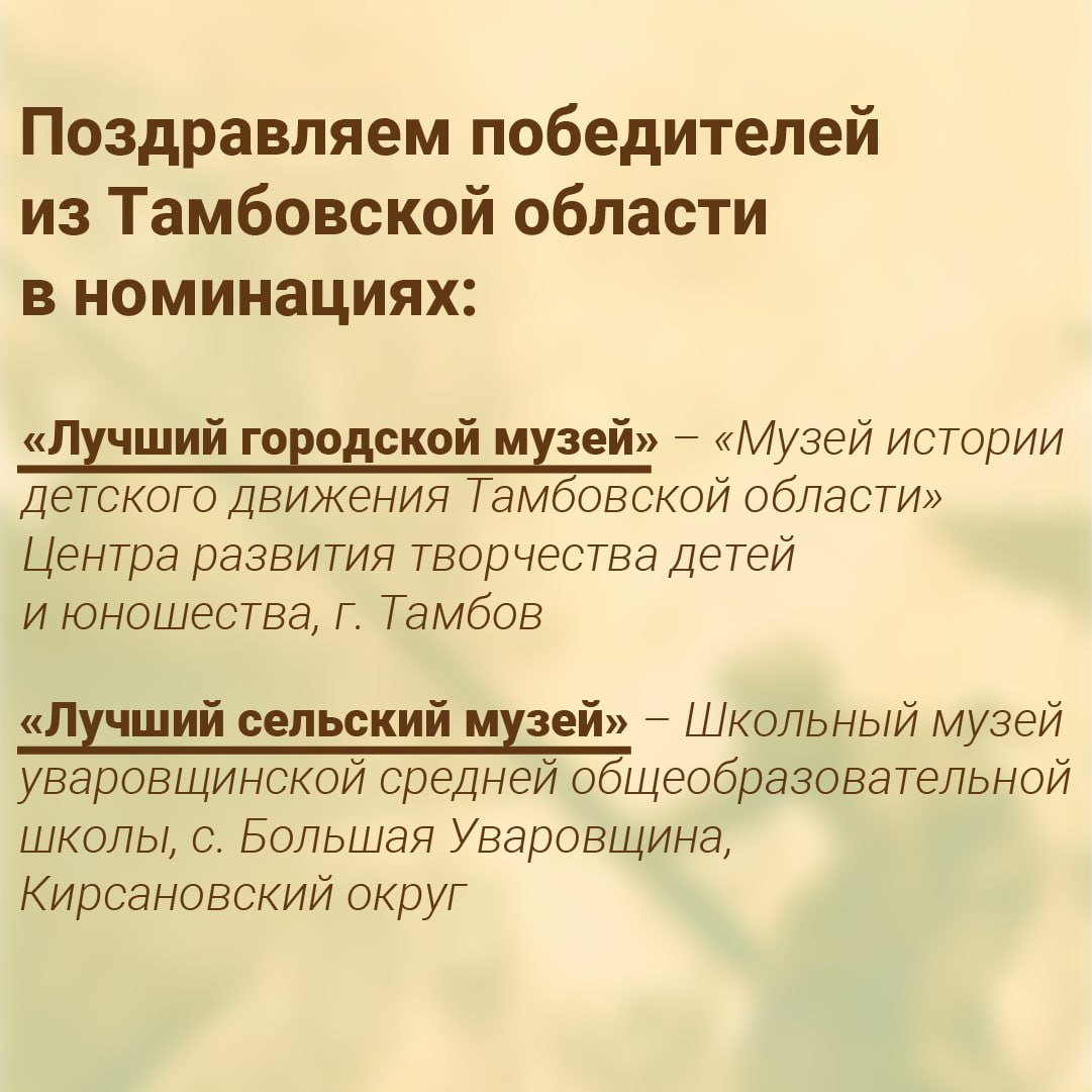 В финал конкурса музеев образовательных организаций вышли 169 музеев России, а победителями стали 92 из них. В их числе – тамбовские школьные музеи. В номинации «Лучший городской музей» второе место занял «Музей истории детского движения Тамбовской области» Центра развития творчества детей и юношества из Тамбова. Третье место в номинации «Лучший сельский музей» занял школьный музей уваровщинской СОШ из села Большая Уваровщина Кирсановского района. Они получат от 200 до 500 тысяч рублей на развитие своей деятельности.