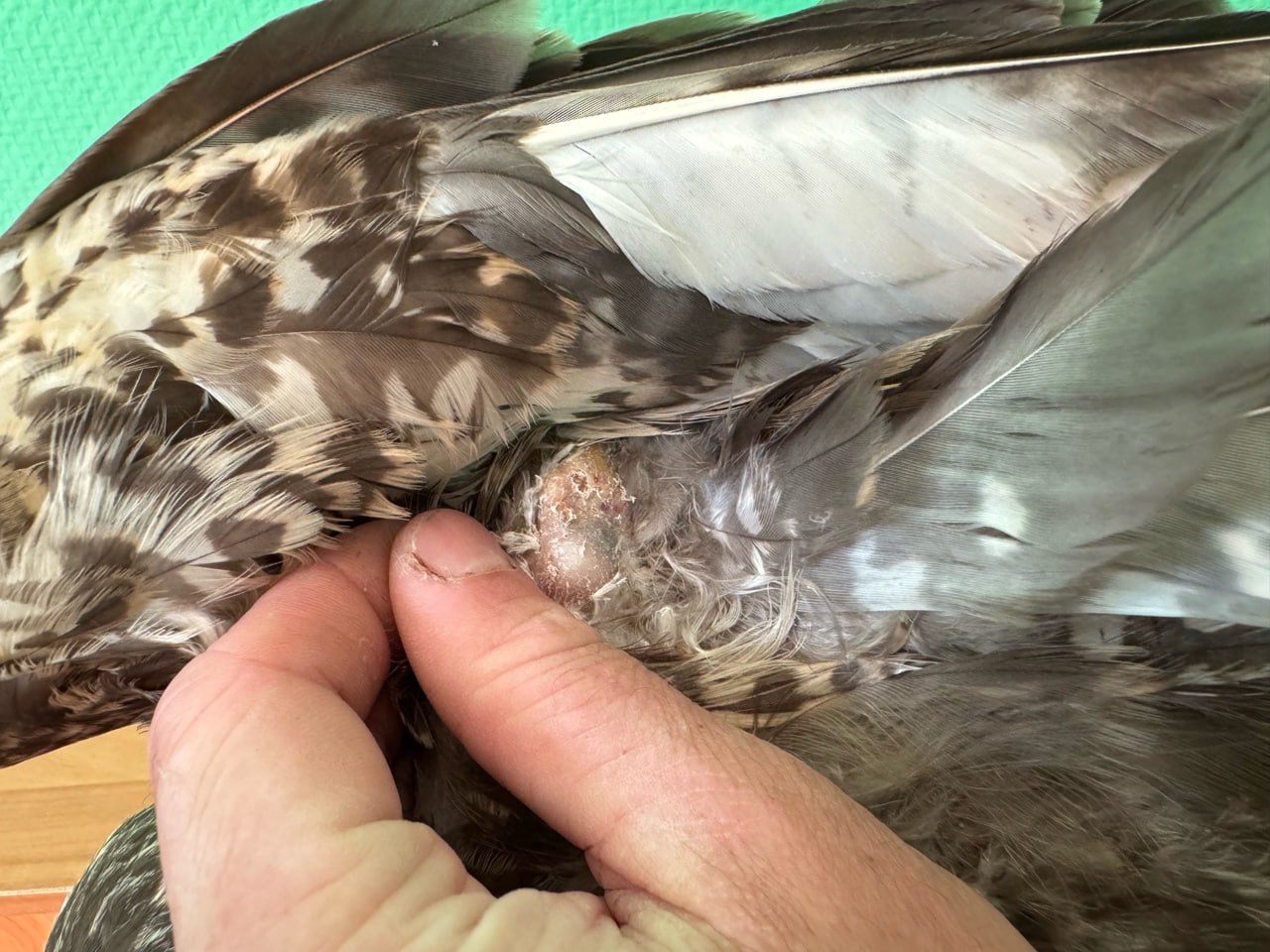 У птицы обнаружен застарелый перелом плечевой кости левого крыла. Перелом уже успел срастись, но неправильно.
