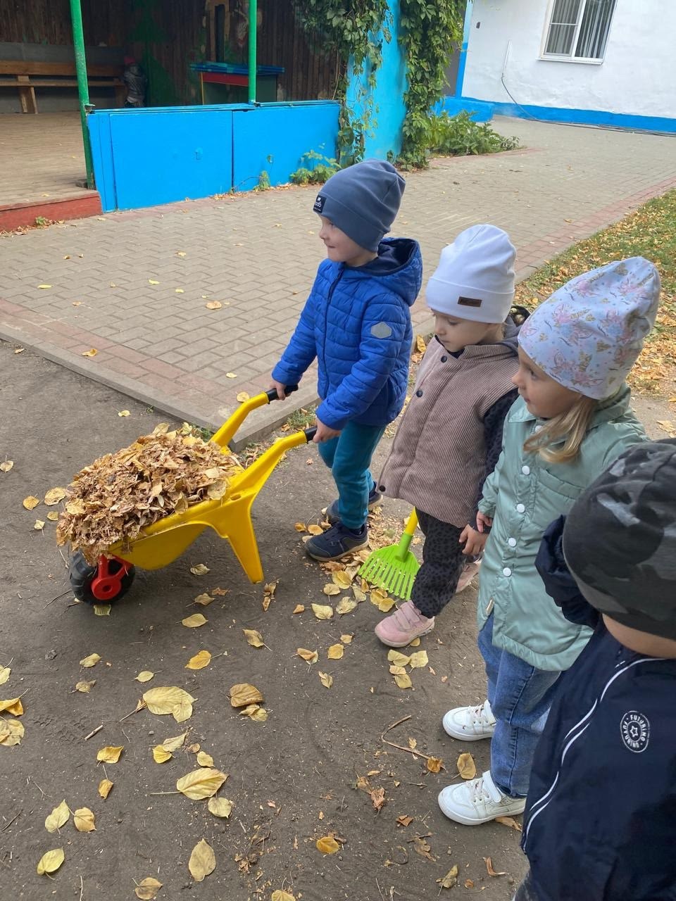 Рядом с воспитателями трудятся малыши, они во всем стараются походить на взрослых. С радостью убирают листву, собирают опавшие ветки и семена цветов. Маленький трудовой десант уже привел в порядок цветники и участки у прогулочных веранд.