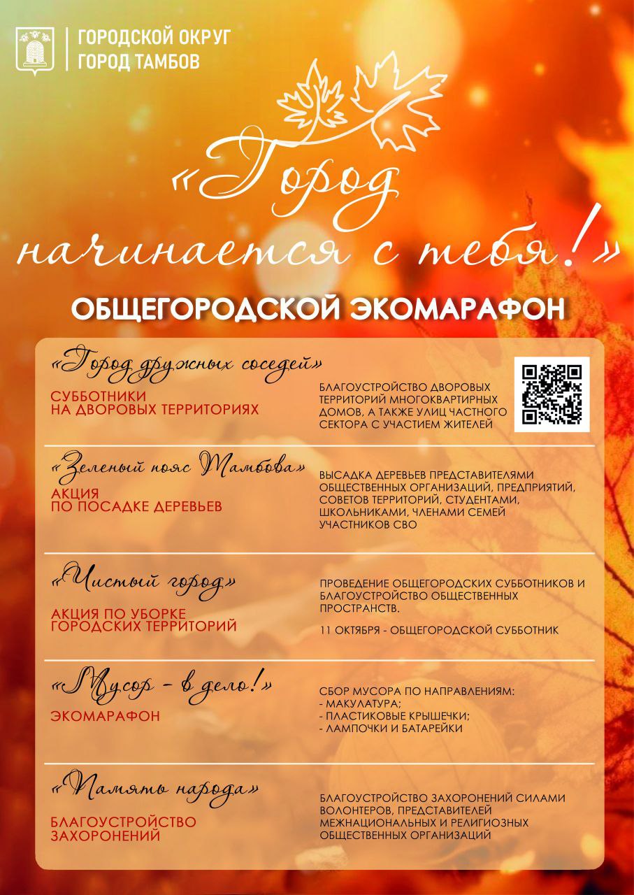 Идет вторая неделя общегородского экомарафона «Город начинается с тебя!». Он проходит в рамках осеннего месячника по благоустройству и наведению санитарного порядка в Тамбове. В генеральной уборке города - днях ударного труда и субботниках - уже приняли участие более 2000 тамбовчан. Еще сотни присоединились к акциям экомарафона. Всего их пять: