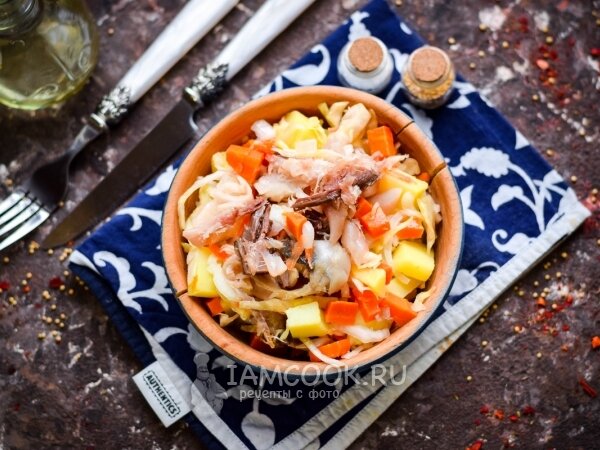 2. Начните с укладки в салатник квашеной капусты. Затем нарежьте остывшие овощи — картофель и морковь — кубиками и добавьте их к капусте.