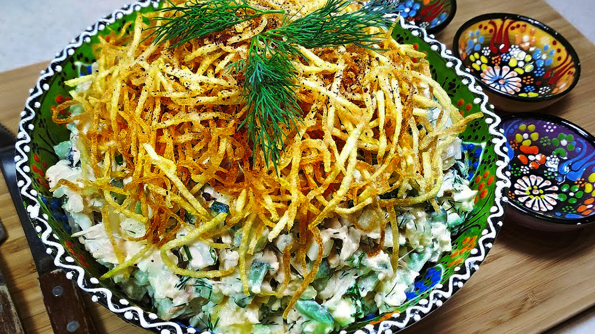 Кулинары знают, что настоящим украшением "Гнезда" станут хрустящие картофельные соломки. Их необходимо нарезать, замочить в воде, а затем обжарить до золотистого цвета. Готовый салат нужно будет заправить майонезом и украсить соломкой – это придаст ему эффектный внешний вид и текстуру.