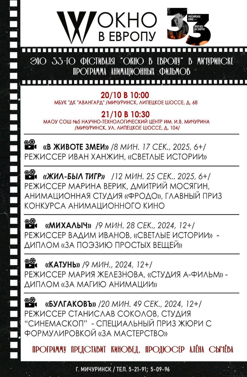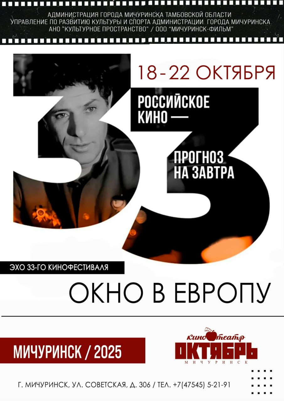 С 18 по 22 октября в Мичуринске пройдёт кинофестиваль «Эхо 33-го кинофестиваля «Окно в Европу» (12+). Площадками масштабного культурного события станут кинотеатр «Октябрь», Дом молодёжи «Космос», Дом культуры «Авангард» и школа № 5 «Научно-технологический центр имени Мичурина». Как сообщает сетевое издание "Мичуринская правда", в церемонии открытия примут участие народная артистка РСФСР Лариса Лужина, народный артист РФ Андрей Соколов и композитор Игорь Слуцкий.