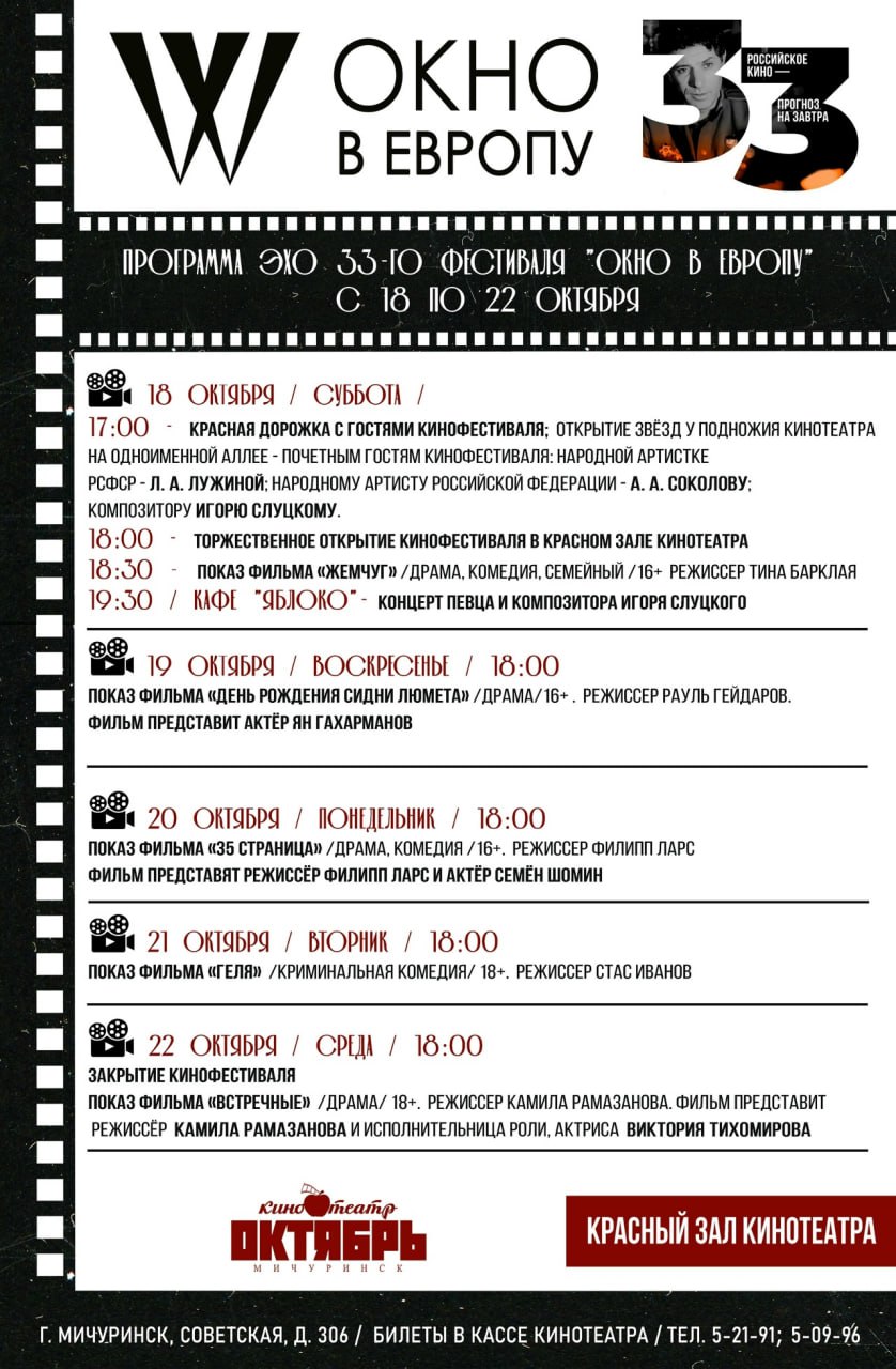 18 октября в 17:00 перед кинотеатром «Октябрь» артистам откроют именные звёзды. А в 18:30 начнётся официальное открытие фестиваля. Вечер продолжится показом фильма «Жемчуг» (16+) и выступлением Игоря Слуцкого.