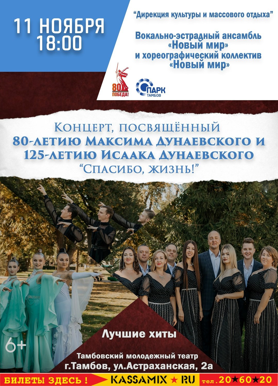 Концерт, приуроченный к юбилеям Исаака и Максима Дунаевских - двух выдающихся композиторов, чьё творчество стало неотъемлемой частью нашей музыкальной культуры, готовят для тамбовчан вокально-эстрадный ансамбль «Новый мир» и хореографический коллектив «Новый мир».