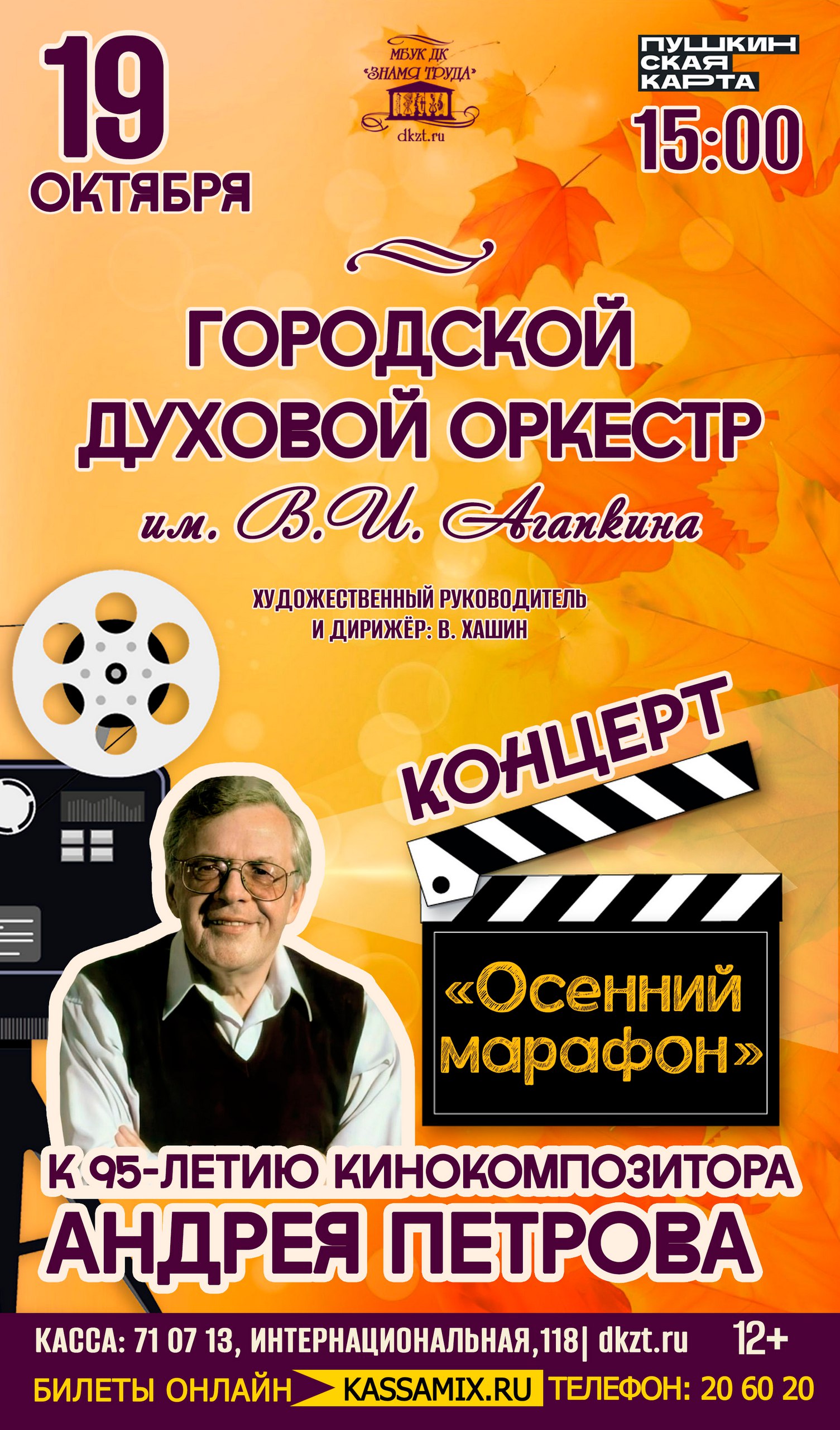 В воскресенье, 19 октября, вконцертной программе «Осенний марафон», посвящённой 95-летию со дня рождения знаменитого кинокомпозитора Андрея Петрова, тамбовчанам предложат яркий музыкальный забег по кинофильмам «Укрощение огня», «Берегись автомобиля», «Жестокий романс», «О бедном гусаре замолвите слово», «Служебный роман» и другим.