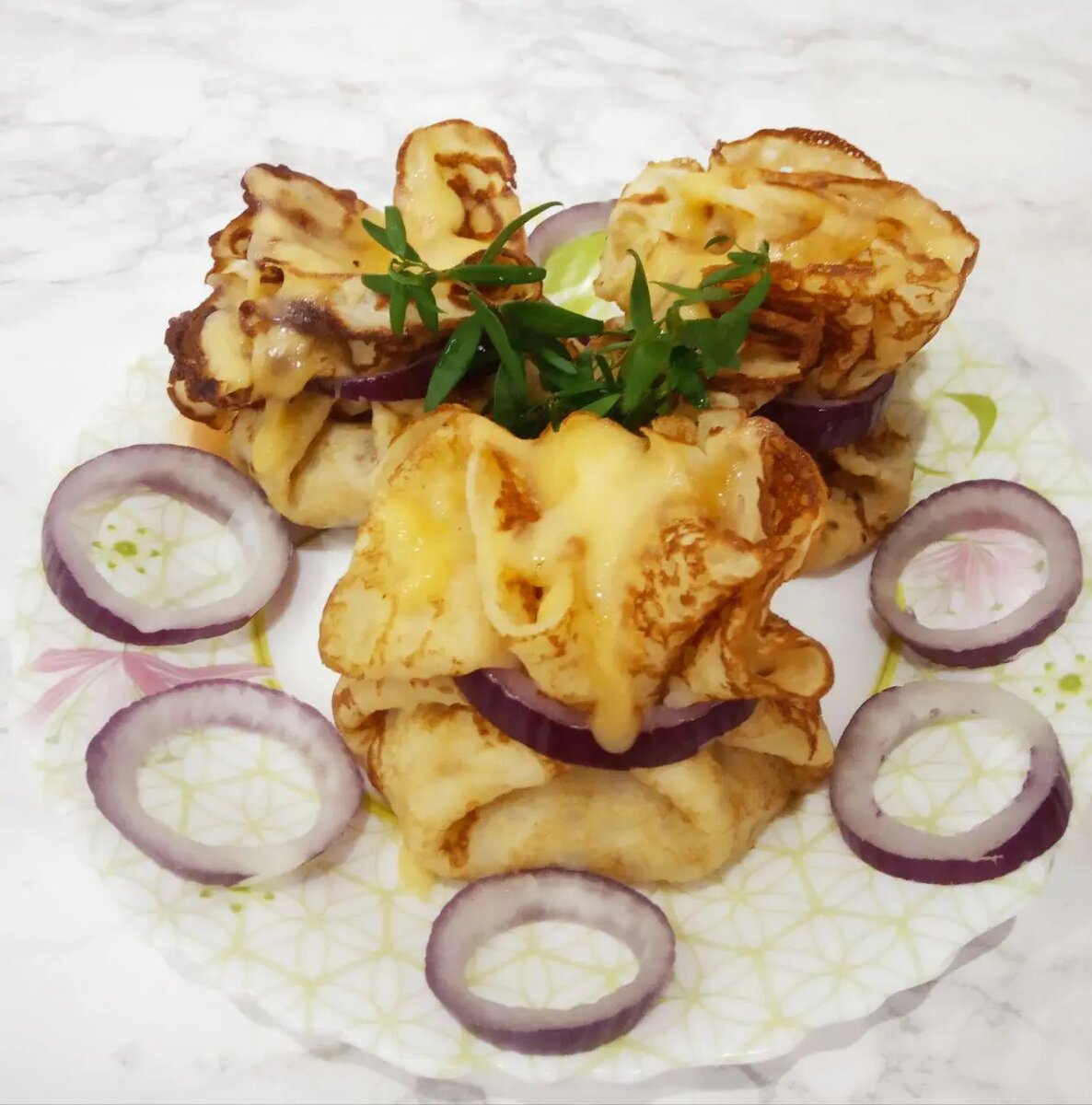 На готовые блины кладут начинку, сворачивают их в виде мешочков и завязывают колечками лука. Для дополнительного аромата и вкуса, перед подачей к столу, блинчики можно смазать майонезом и посыпать тертым сыром, а затем поставить их в духовку на несколько минут.