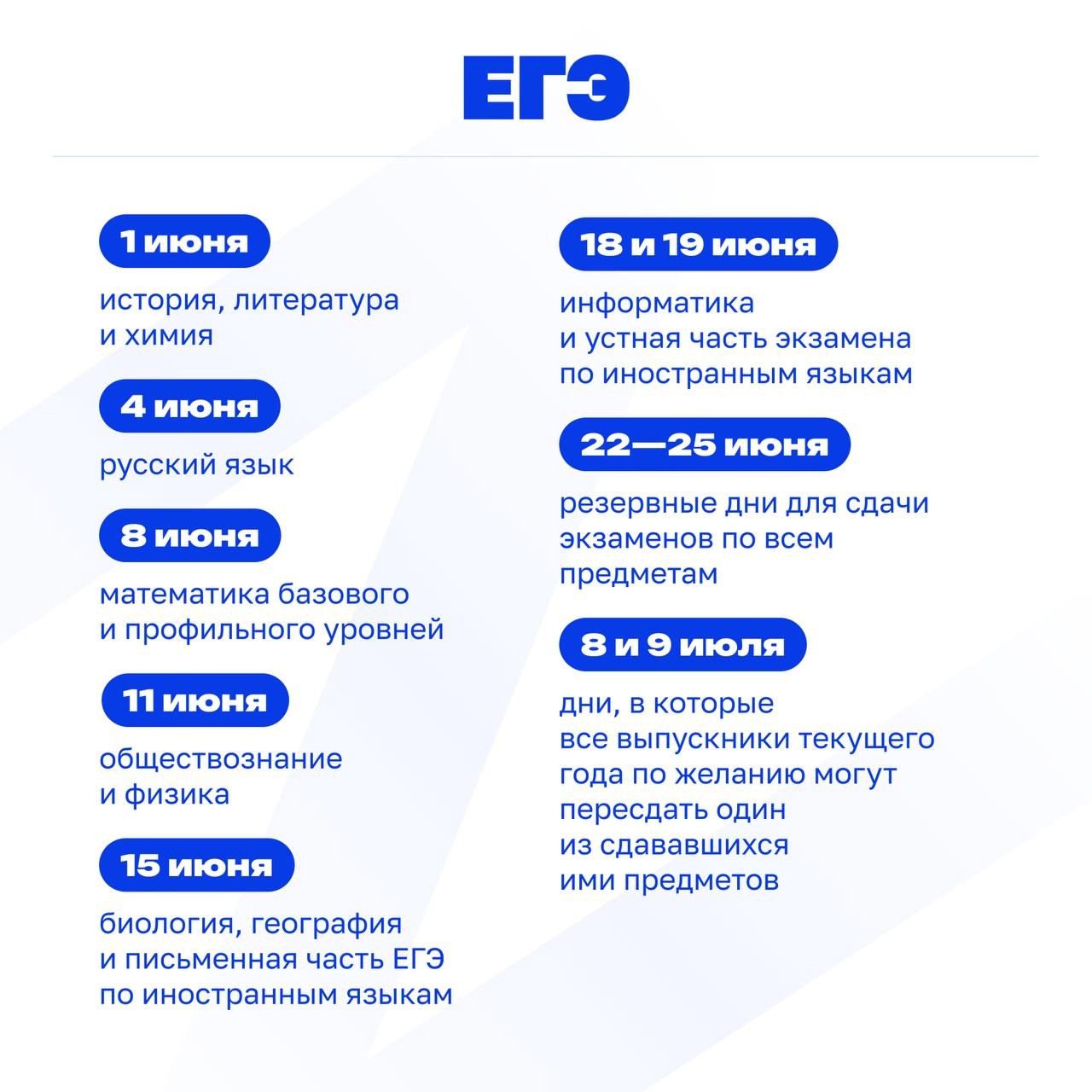 Проведение досрочного периода ЕГЭ планируется с 20 марта по 20 апреля, основного периода — с 1 июня по 9 июля, дополнительного периода — с 4 по 25 сентября.