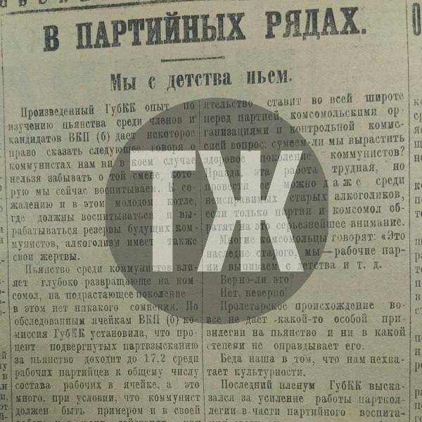 Комиссия ГубКК вовсю борется с пьянством среди молодых коммунистов. К сожалению, молодежь берет пример со старшего поколения. Почти пятая часть сотрудников рабочей ячейки была наказана за употребление алкоголя. Многие комсомольцы оправдывают пьянство тем, что они выпивают с детства. ГубКК собирается усилить борьбу с вредной привычкой посредством партийного воспитания среди комсомола.