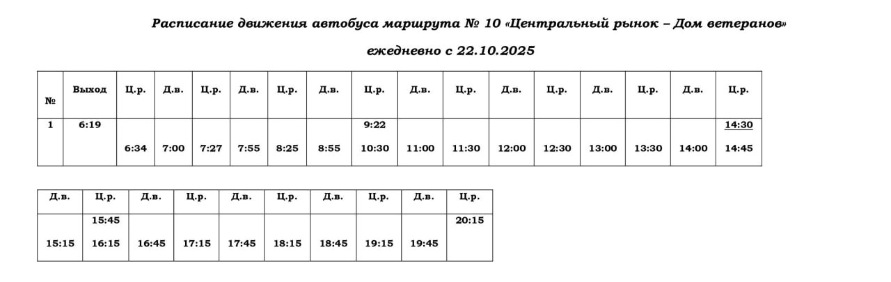 Кроме того, будет скорректировано расписание по маршруту № 10 «Центральный рынок – Дом ветеранов». С 22 октября автобус будет работать по следующему графику: