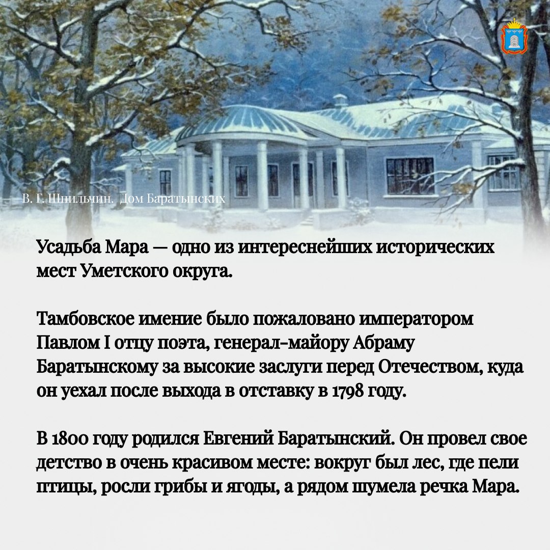 Усадьба Мара на территории Уметского округа известна как родовое гнездо великого русского поэта Евгения Баратынского