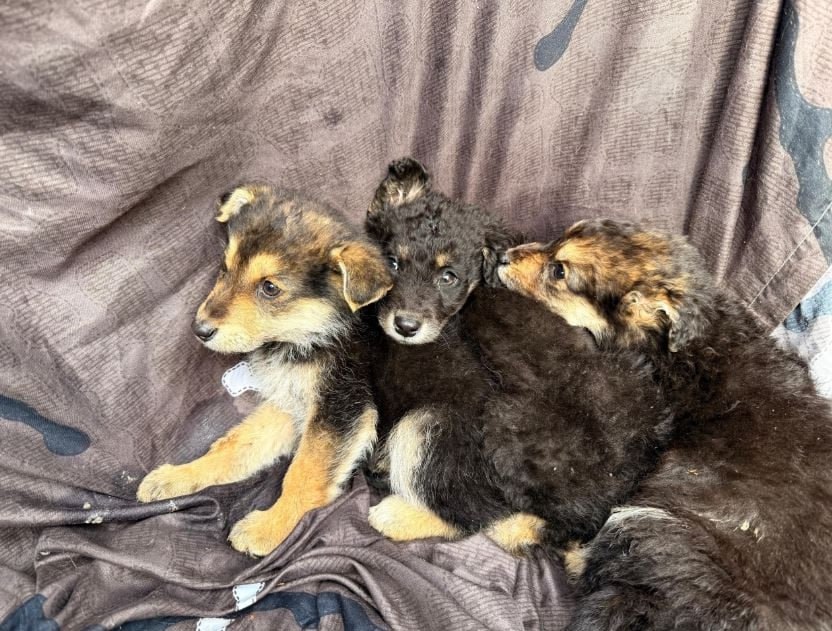 Все три щенка мальчики. Они ласковые, едят всё.