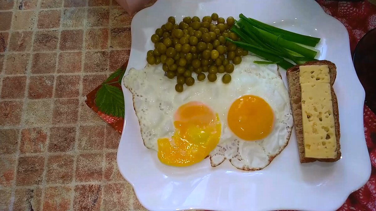 Завтрак 1: Яичница с зелёным горошком, дополненная бутербродом и чашечкой кофе с молоком. Для этого необходимо: