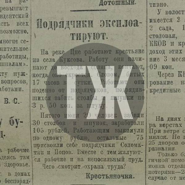 На реке Цна крестьяне из села Куксова вынуждены работать по 17 часов в сутки в тяжелейших условиях. Однажды бригада из 20 человек, забив 30 столбов и шпунок, заработала 105 рублей. Однако подрядчики Соломатин и Попов раздали рабочим по рублю, а остальную сумму оставили себе. При этом, инспекция по Охране Труда никак не реагирует на происходящий произвол в виде махинаций с оплатой и непосильной работы.