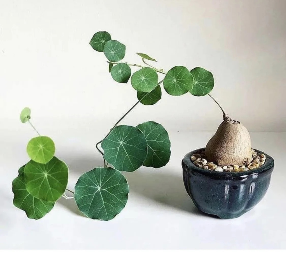 Стефания не только выглядит непривычно, но и имеет шикарные листья – идеальные круглые тарелочки с изящной сетчатой жилкой. Такой контраст между массивным клубнем и нежными листьями делает это растение ещё более притягательным. Тем не менее стоит помнить, что забота о стефании требует внимания и терпения. Каждую зиму она впадает в спячку: листья и стебель отмирают, оставляя только клубень, который на время отправляется в темное и прохладное место. С приходом весны начнётся новый цикл – из клубня пробьется новый стебель.