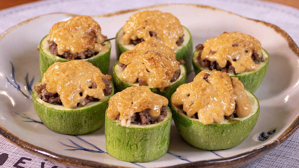 Кабачки необходимо нарезать поперек на кусочки толщиной до трех сантиметров и вынуть их сердцевину, чтобы освободить место для начинки. Подготовленные заготовки помещаются на противень, выстланный пергаментом, и наполняются мясным фаршем. Для соуса в отдельной миске смешиваются майонез, соевый соус и лимонный сок, после чего эта смесь щедро поливается сверху на фаршированные кабачки.
