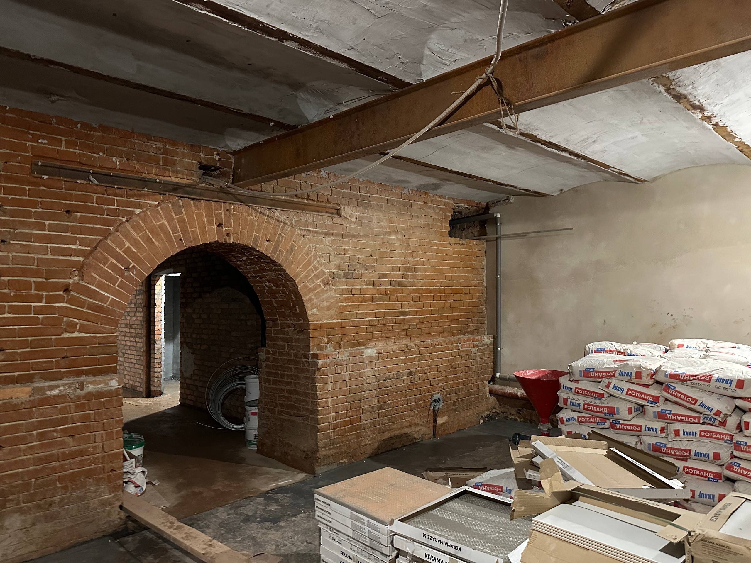 Сейчас помещения первого этажа практически завершены. Круглосуточно ведутся работы в подвальном помещении. За счёт сохранения старинной кирпичной кладки здесь будет очень интересная локация.