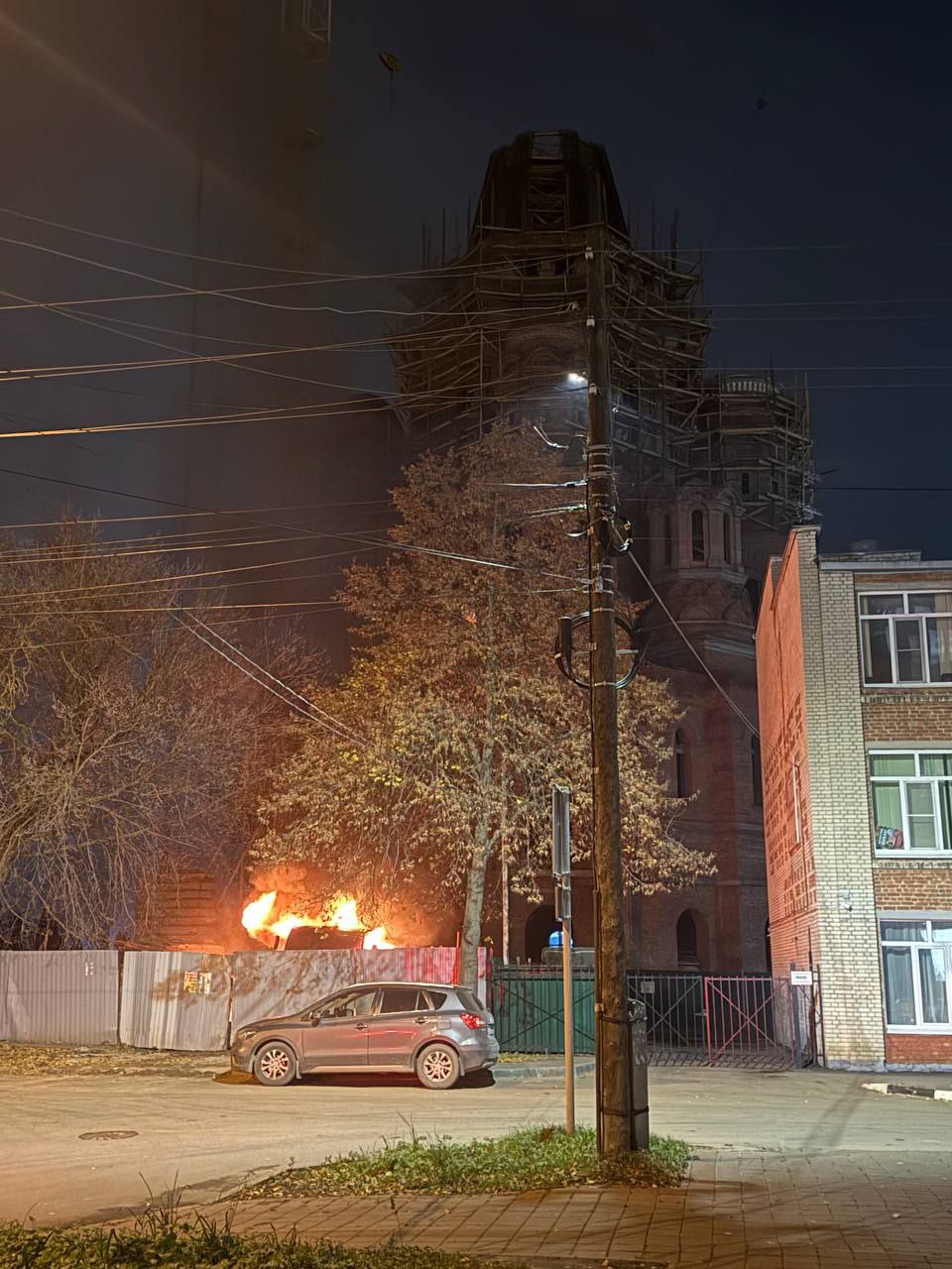 На строительной площадке нового храма на улице Кронштадтской областного центра горит грузовик. Для тушения пылающего КамАЗа уже прибыли автоцистерны из ближайших пожарных частей.