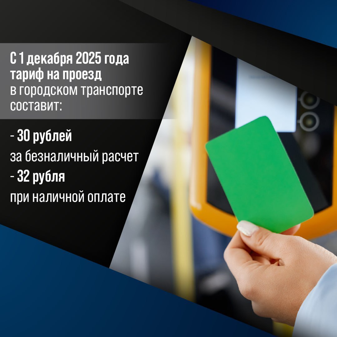 Напомним, с 1 декабря 2025 года тариф на проезд в городском транспорте составит 30 рублей за безналичный расчёт и 32 рубля при наличной оплате.
