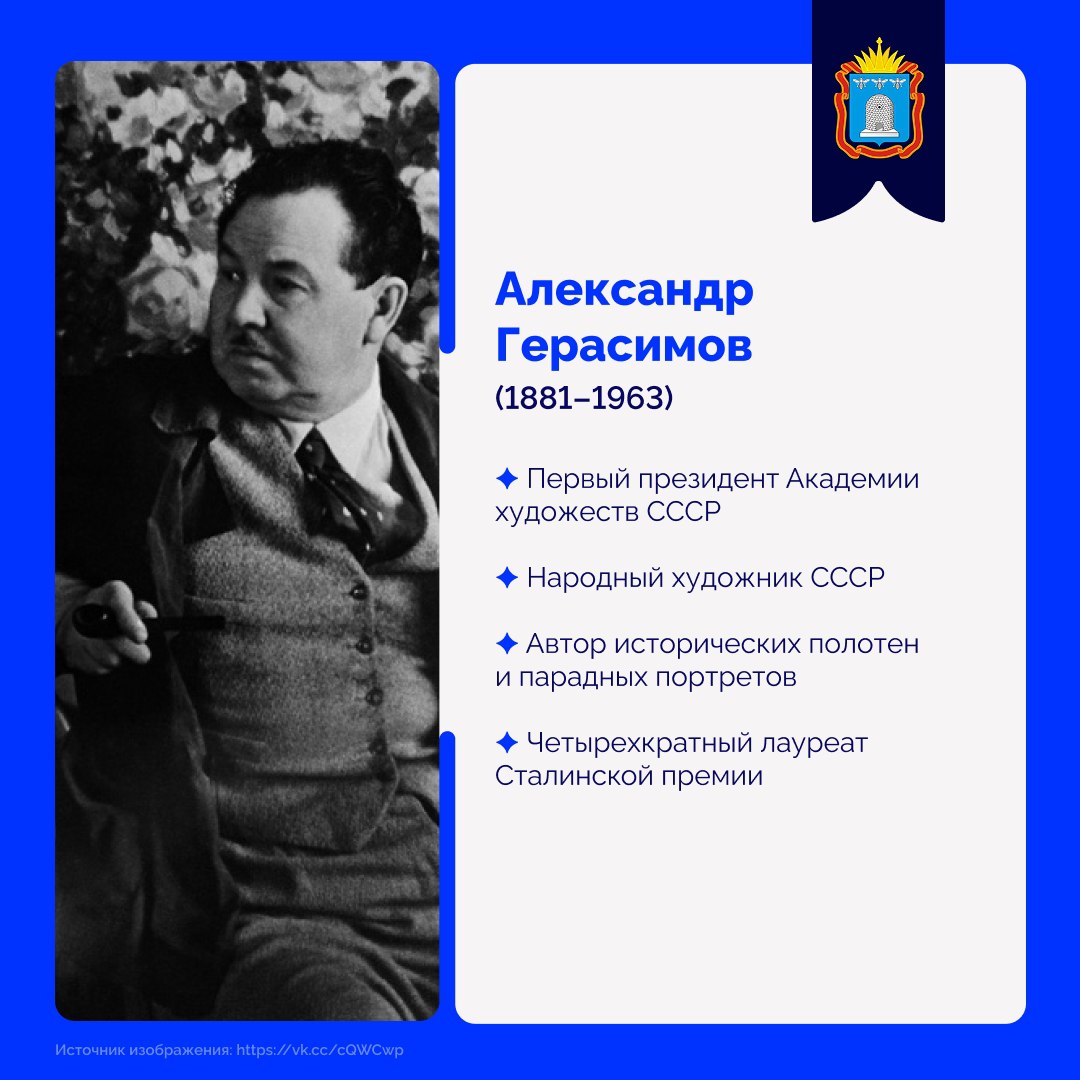 Александр Герасимов — выдающийся советский художник, первый президент Академии художеств СССР, автор знаменитых полотен «И. В. Сталин и К. Е. Ворошилов в Кремле» и «Гимн Октябрю». Он родился и вырос в Козлове (ныне — Мичуринск) Тамбовской губернии, где начался его творческий путь. В родном городе сохранилась усадьба художника, превращенная в музей с богатейшей коллекцией работ. Здесь же установлен бронзовый бюст Герасимова работы Евгения Вучетича.