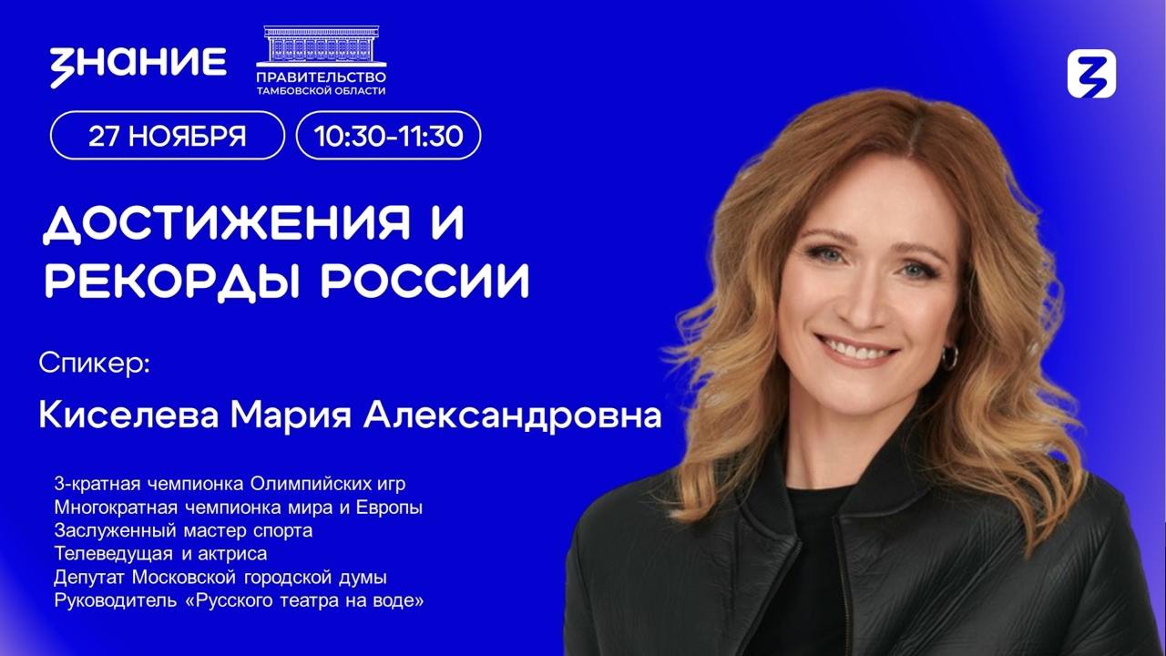 В Тамбовской области продолжается молодежный форум «Дружба народов». 27 ноября в 10:30 перед участниками форума с очной лекцией «Достижения и рекорды России» выступит российская спортсменка-синхронистка, телеведущая, актриса и депутат Мария Киселева. Лекция пройдет при поддержке общества «Знание».