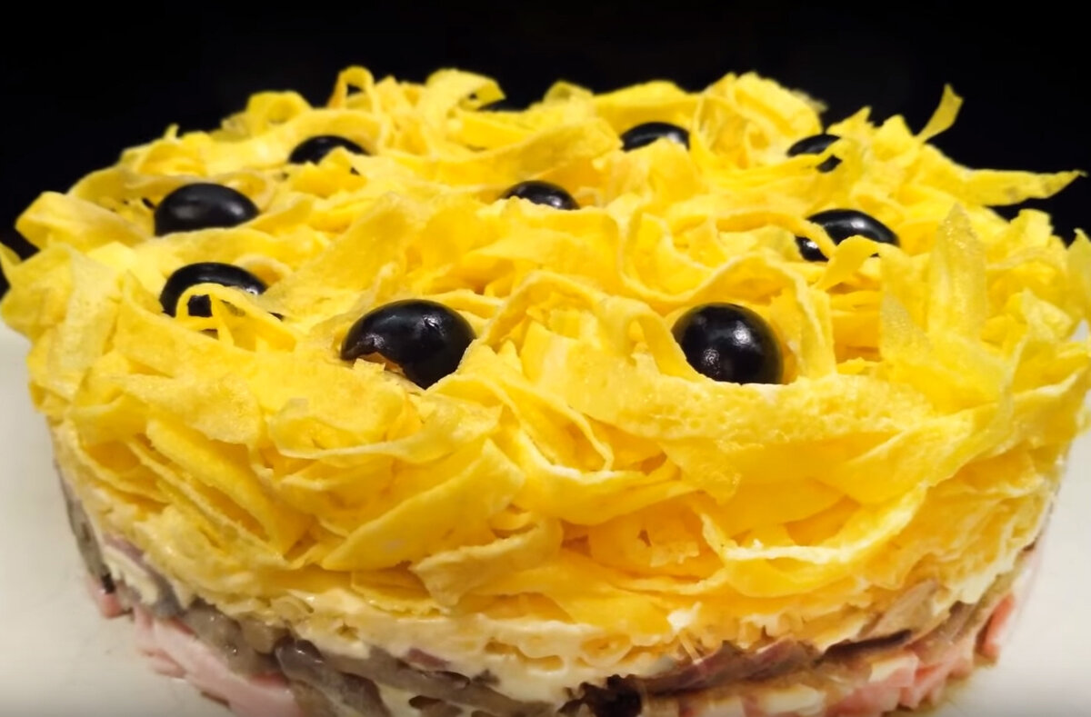 На завершение укладываются натертый сыр и последние блинчики. После завершения сборки салата его нужно охладить в холодильнике на 30 минут для полноценного пропитывания. Для финального штриха может быть добавлено несколько маслин для украшения.