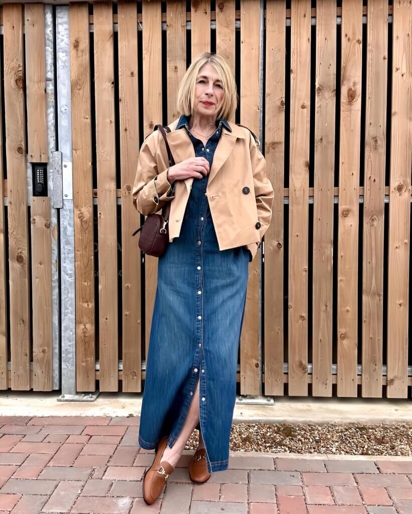 - Джинсовое платье макси. Это универсальный вариант для повседневной жизни. Прекрасно смотрится платье прямого кроя с кнопками, которое можно носить открытым или закрытым. Когда погода позволяет, его можно дополнить укороченным плащом в бежевых тонах и коричневыми лоферами. Завершите образ стильной сумочкой через плечо.