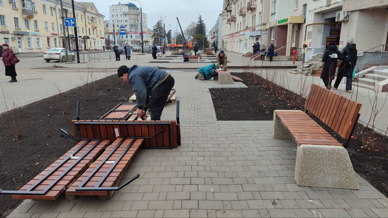 Сегодня в обновлённом пространстве на улице Октябрьской приступили к монтажу новых элементов инфраструктуры. Всего запланировано установить 18 скамеек и столько же урн, выполненных из долговечных материалов: дерева, металла и бетона. Новые конструкции выглядят стильно и гармонично вписываются в общий архитектурный ансамбль территории.