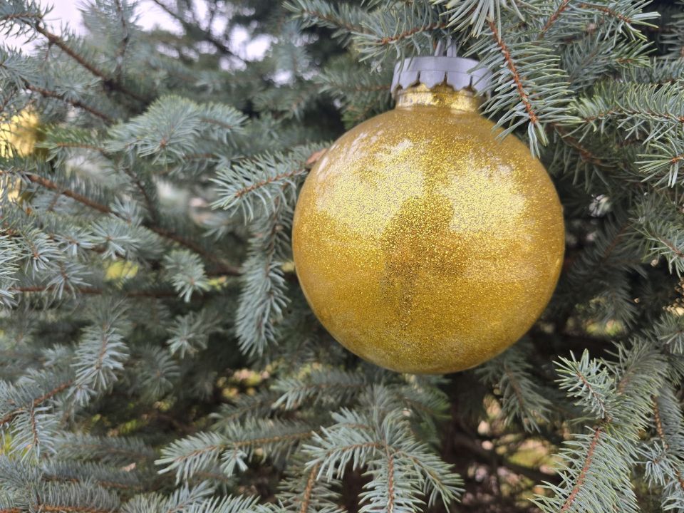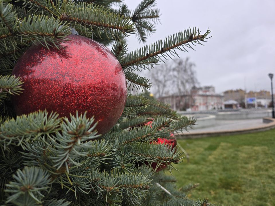 Украшением елей стали яркие шары, колокольчики и кубы. Отдел дизайна Дирекции благоустройства и озеленения города остановились на классическом сочетании красного и золотого.