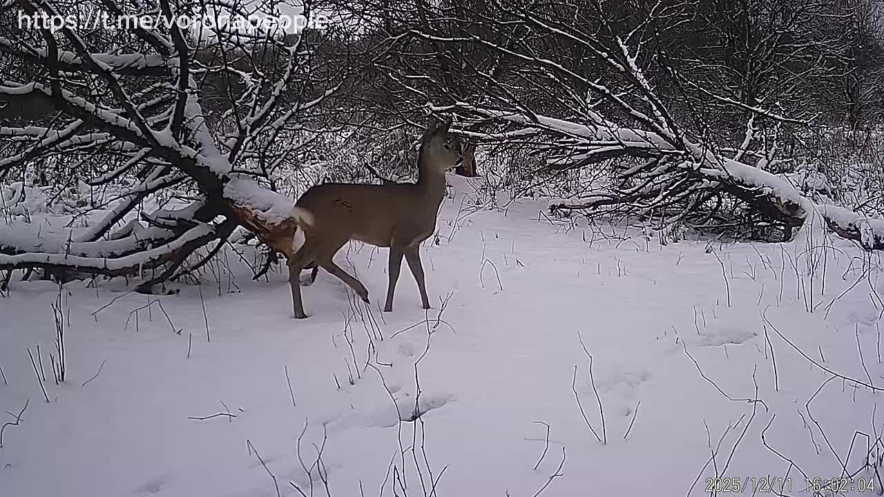 Косуля в заснеженном саду. Бобры повалили яблони, но унести не успели