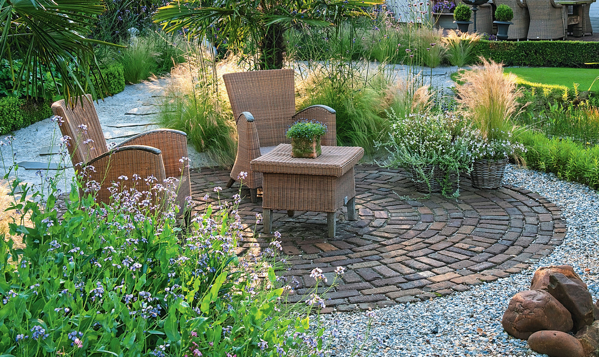 Отсыпанные гравием или щебнем площадки выглядят более открытыми и элегантными по сравнению с традиционными брусчатками. Этот материал позволяет легко создавать замысловатые формы, а также комбинировать его с растениями для достижения гармонии с природой. Менять такие покрытия также проще и дешевле, чем брусчатку, что делает их отличным выбором для любого сада.